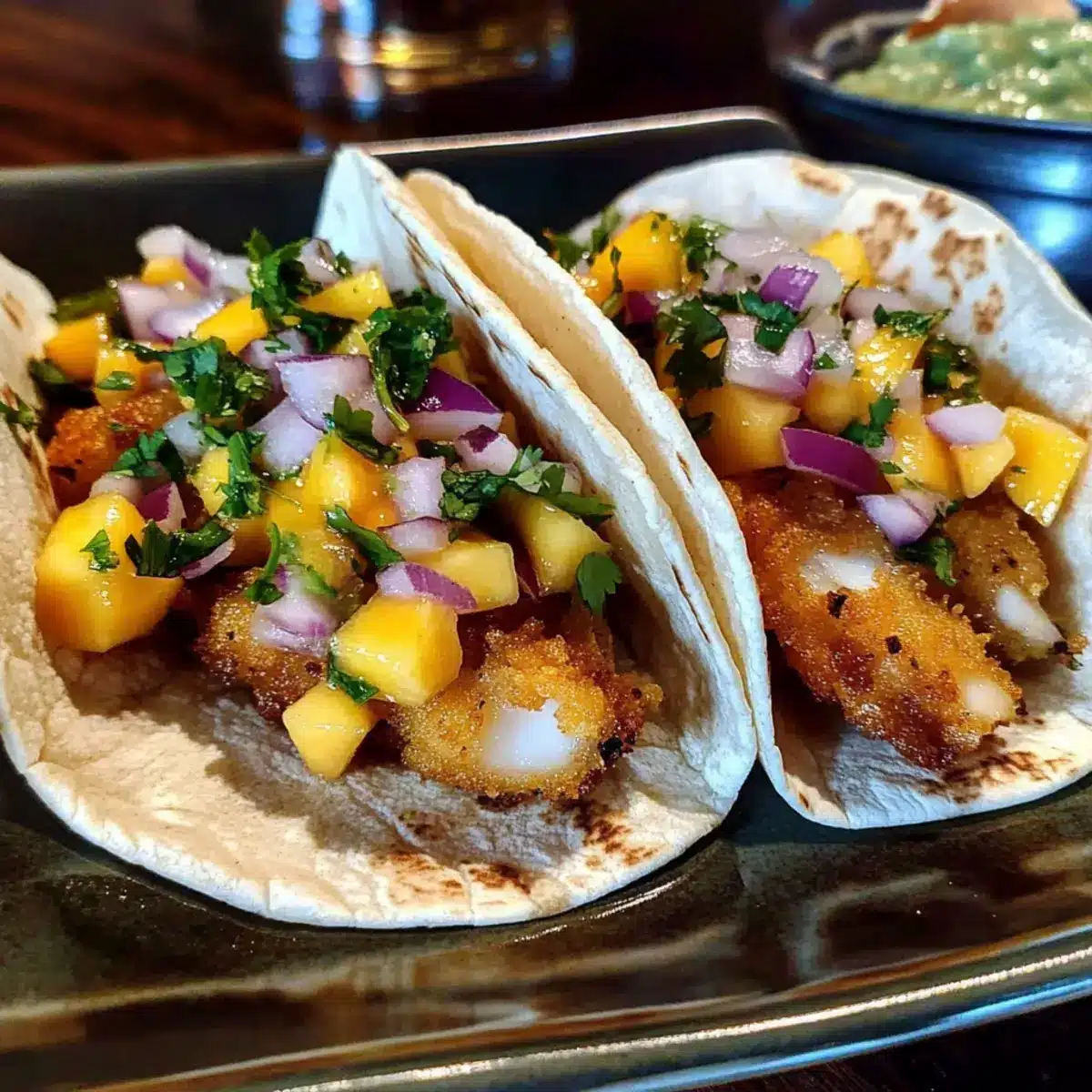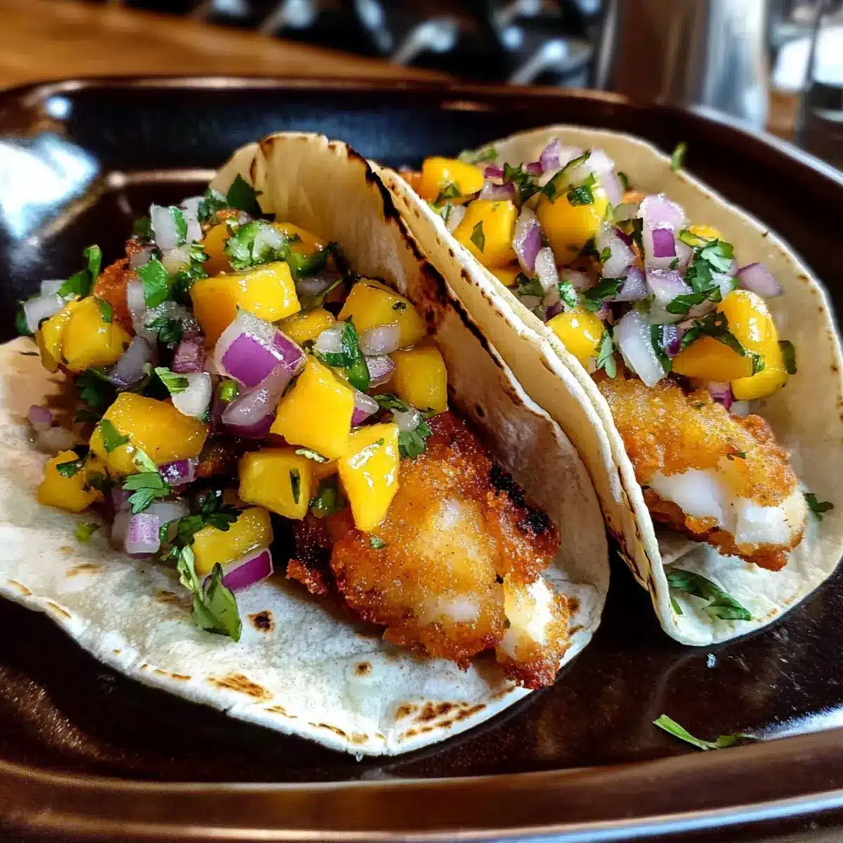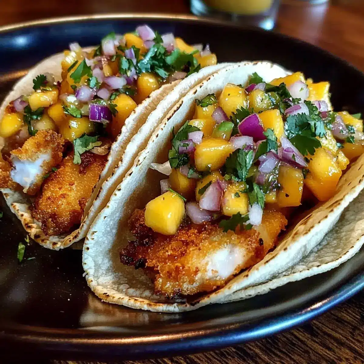 - To assemble your tacos, take a warm tortilla, place a portion of crispy fried fish, and top with fresh mango salsa. Serve immediately.