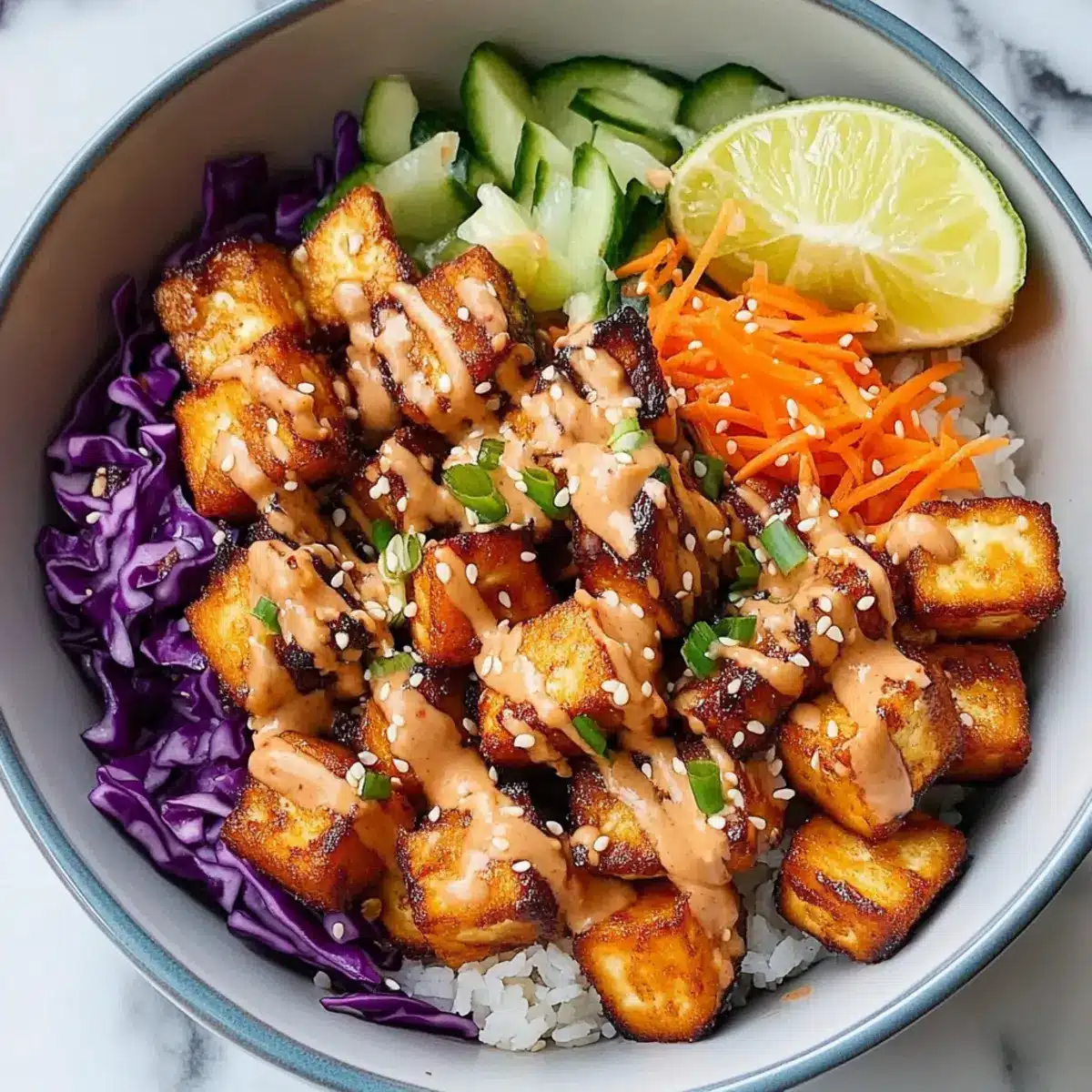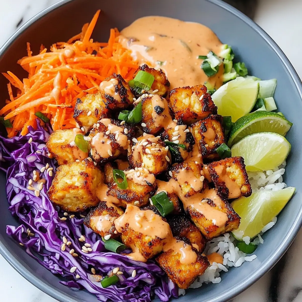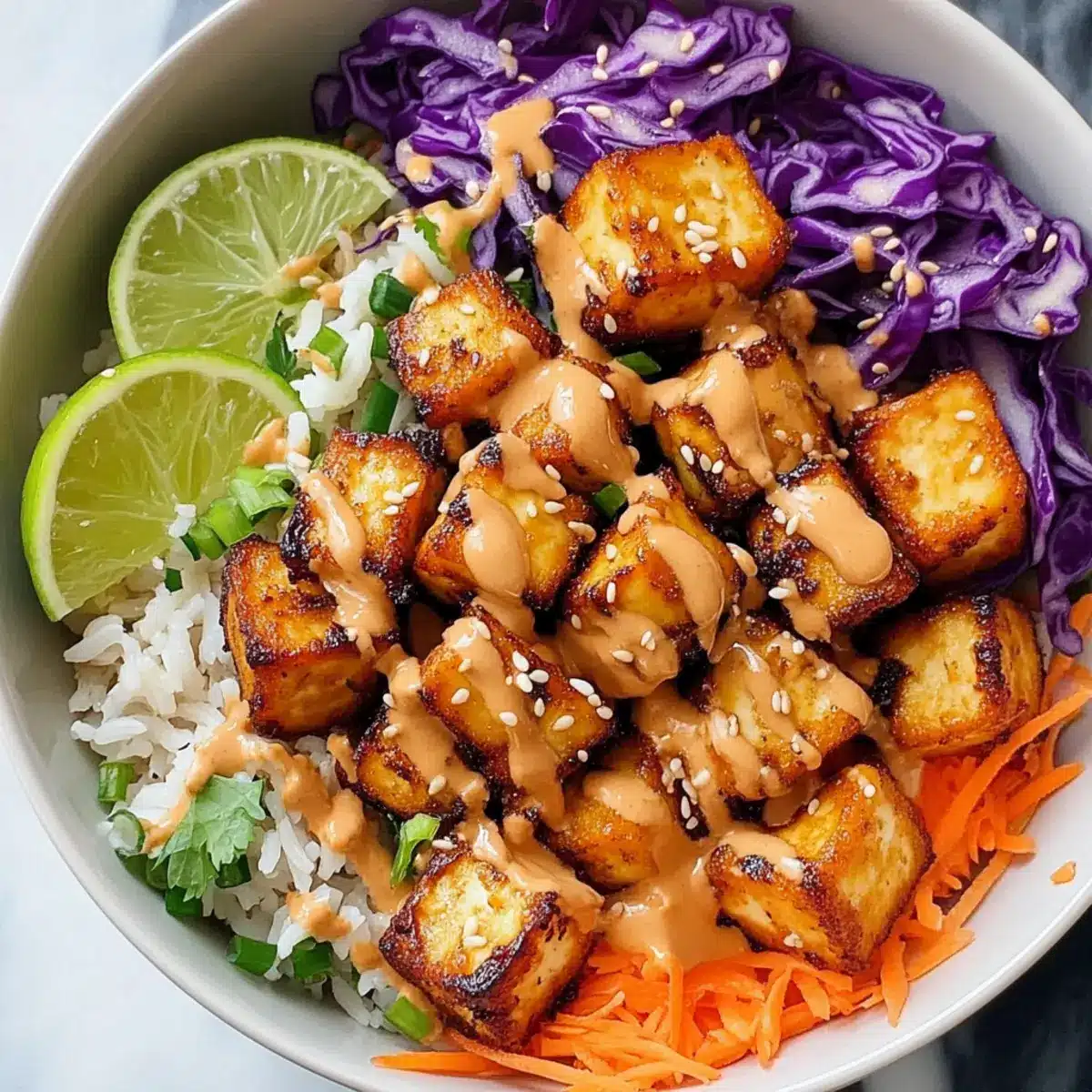 To serve, place a generous scoop of cooked jasmine rice in bowls and top with the coated bang bang tofu. Add your choice of fresh veggies, such as shredded purple cabbage, julienned carrots, or sliced cucumber. Drizzle the remaining sauce on top and garnish with sesame seeds and lime wedges for a vibrant, complete meal.