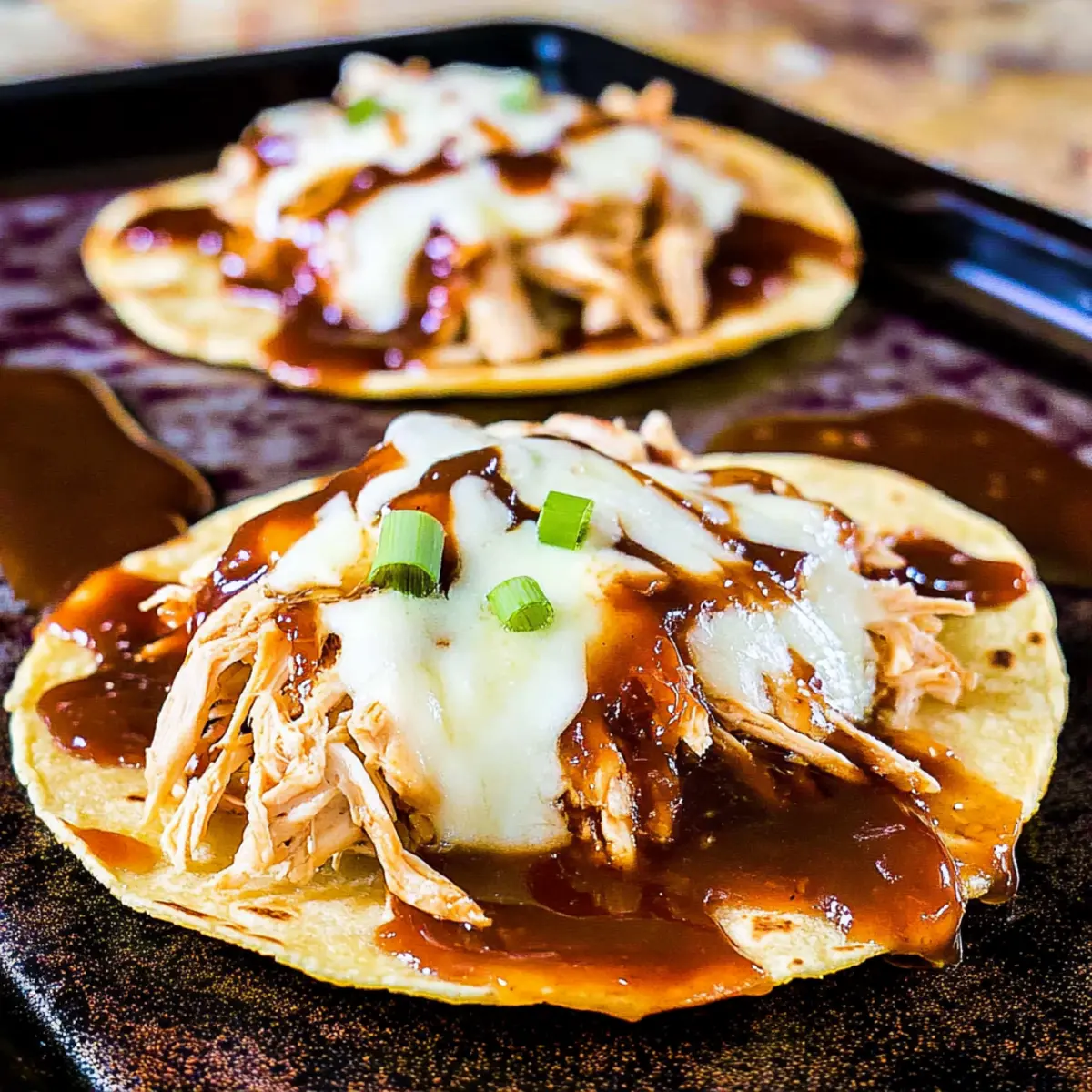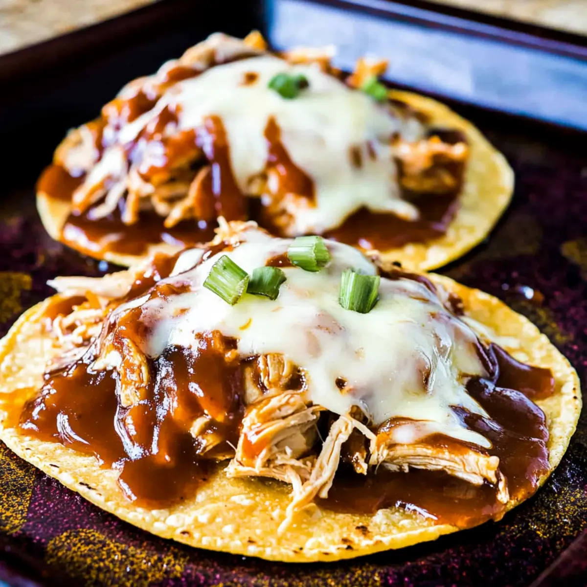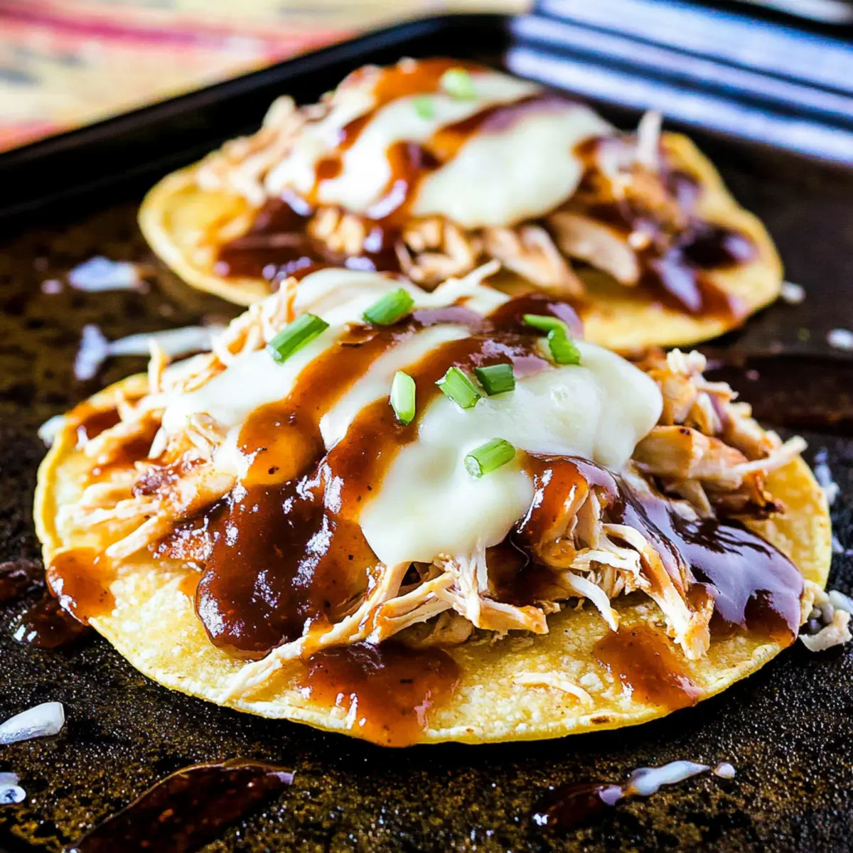 Once baked, remove the tostadas from the oven and drizzle with any remaining barbecue sauce for extra flavor. If you desire, sprinkle thinly sliced green onions on top for a fresh crunch. Your beautiful Barbecue Chicken Tostadas are ready to enjoy, bringing smiles to the dinner table!