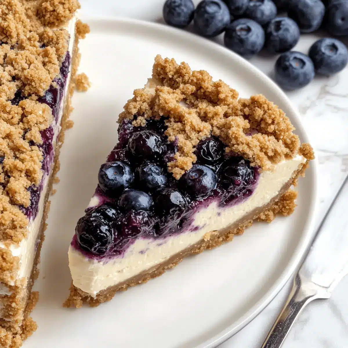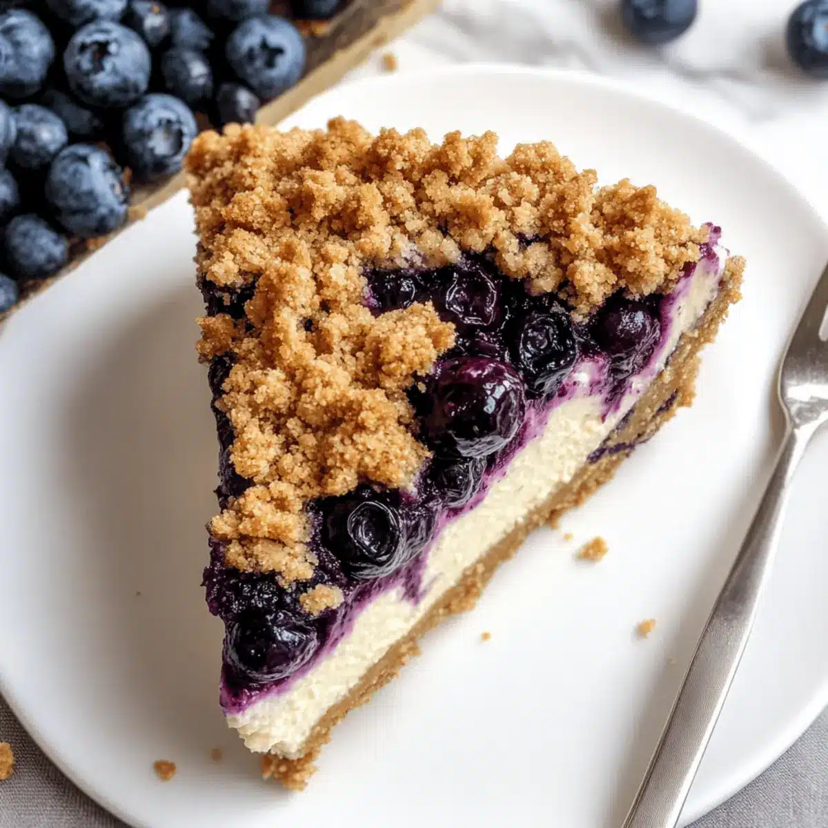 As I stood in my kitchen, the air rich with the sweet scent of baking blueberries, I knew something magical was about to emerge from the oven. This Blueberry Crumble Cheesecake combines the creamy indulgence of classic cheesecake with the delightful crunch of a crumble topping, creating a dessert that’s as visually stunning as it is delicious. Perfect for family gatherings or a cozy night in, this recipe is not only impressive but also quick to prepare, allowing you to spend more time enjoying your creation rather than worrying over it. Imagine slicing through that buttery graham cracker crust to reveal layers of luscious cheesecake interspersed with juicy blueberries and a satisfying crumble. Who wouldn’t want a slice of this irresistible treat? Ready to dive into this delightful fusion of textures and flavors? Let’s get baking!