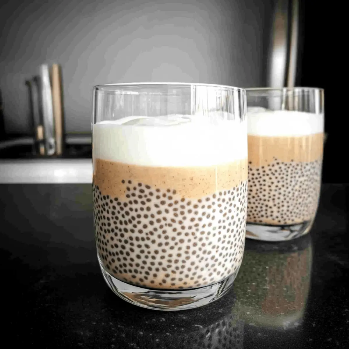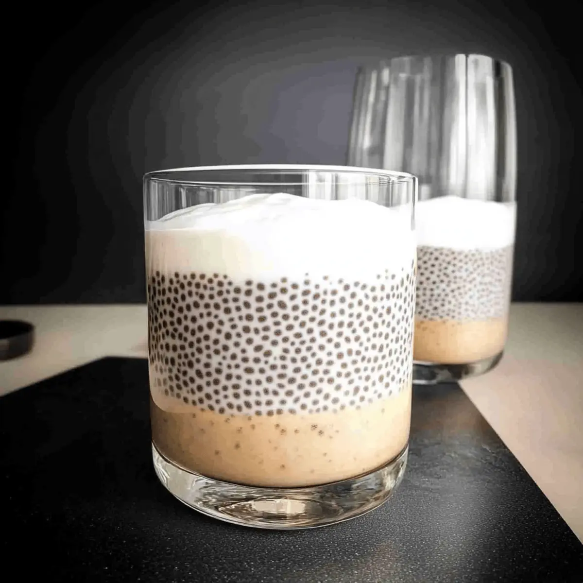 Once chilled, stir in the chia seeds until evenly distributed throughout the mixture. This is the magic step that gives your pudding that signature boba-like texture. Afterward, pour the pudding mixture into two glasses or bowls, leaving a bit of space at the top, and refrigerate for at least 3 hours or until the pudding is set and thickened.
