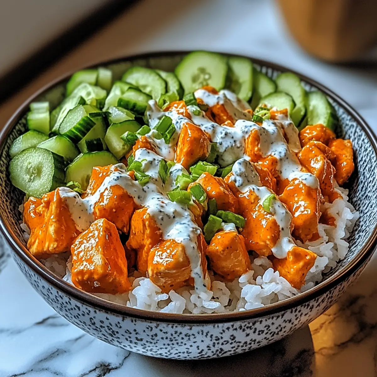 Flavors Unite: This bowl combines the spice of buffalo chicken with crunchy veggies, creating a symphony of flavors.