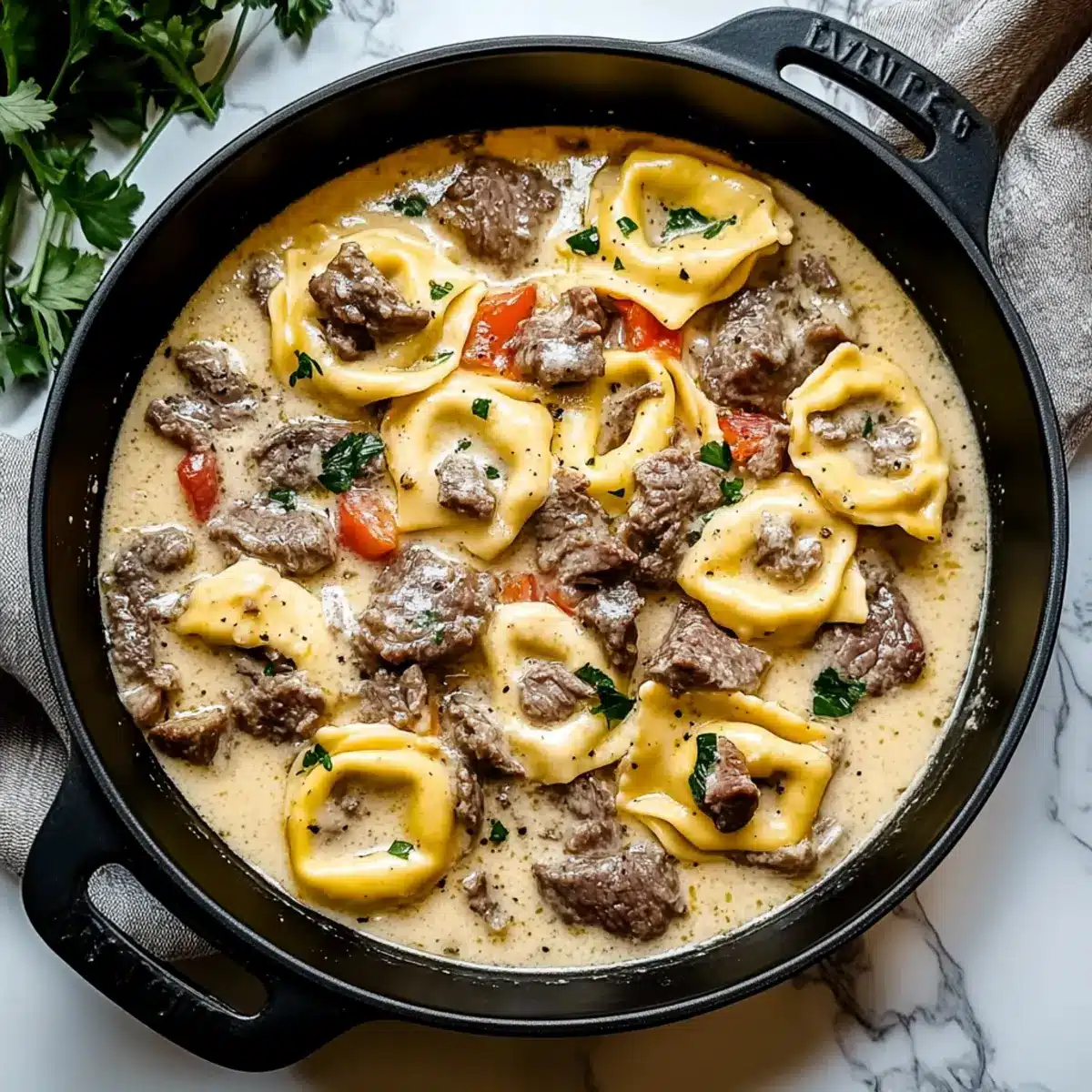Cheesesteak Tortellini in Creamy Provolone Sauce Delight