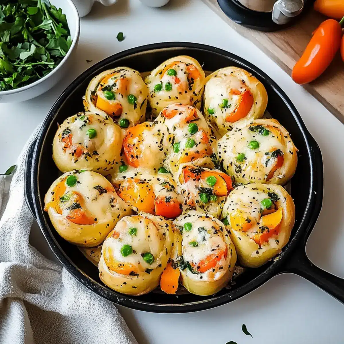 These Cheesy Baked Vegetable Rolls are perfect for meal prep, allowing you to savor homemade goodness even on the busiest nights. You can prepare the dough and filling up to 24 hours in advance. Simply make the rolls, cut them, and layer them in a greased baking dish. Cover tightly with plastic wrap and refrigerate until you’re ready to bake. To maintain quality, avoid brushing them with butter until just before baking; this keeps the tops from getting soggy. When it’s time to enjoy, preheat your oven and bake directly from the fridge, adding an extra 5-10 minutes if needed for them to heat through. Enjoy restaurant-quality results with minimal effort!