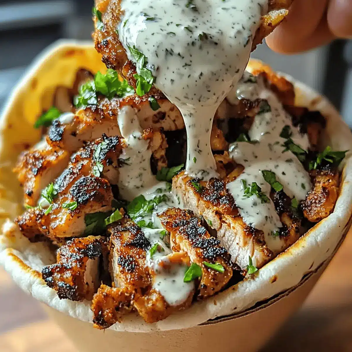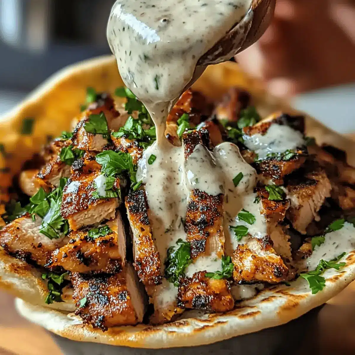 - Layer the sliced chicken in pita bread or arrange on a plate. Drizzle with the garlic sauce and add toppings as desired.