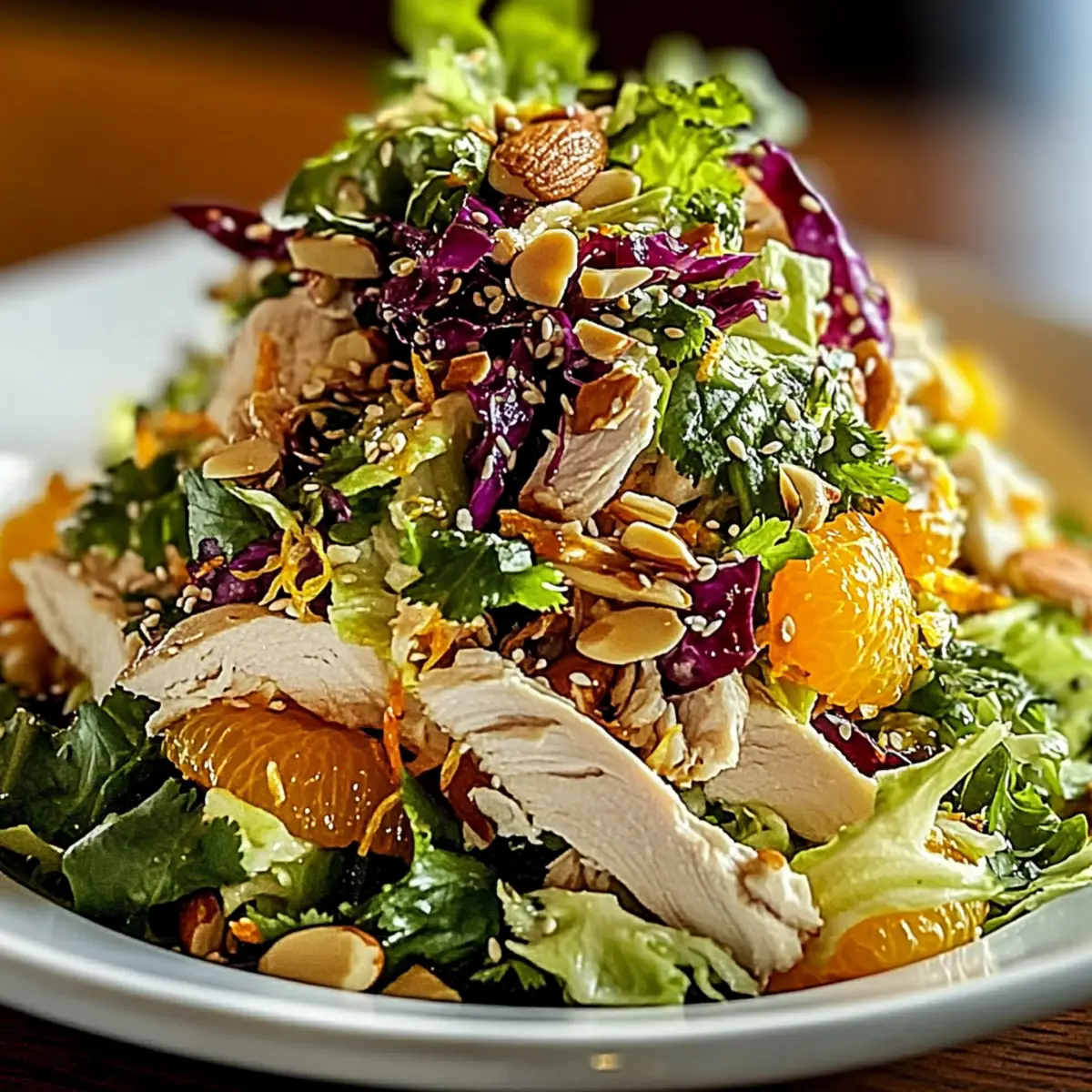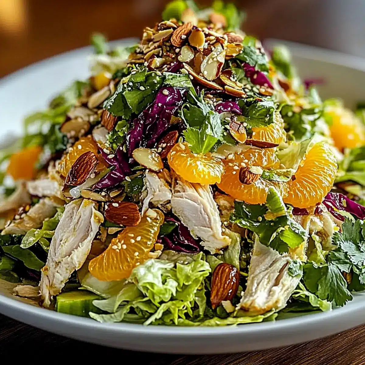 Just before serving, sprinkle sliced almonds, sesame seeds, crispy wonton strips, and segments of mandarin oranges atop the salad for added crunch and flavor. The textures and colors should be inviting; serve immediately for the best freshness, or refrigerate for up to 30 minutes for enhanced flavor.