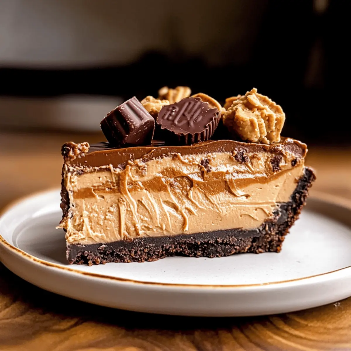 - Before serving, garnish with crushed peanut butter cups, slice, and enjoy!