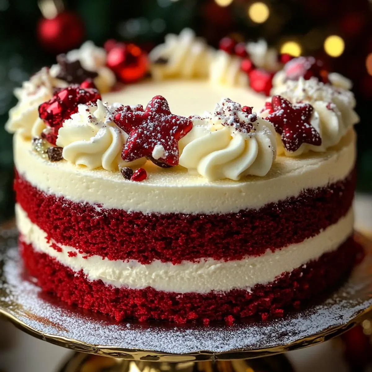 Once all layers are completely cool, gently remove the red velvet cakes from their pans. Place the cheesecake layer on a serving plate or cake stand, then carefully stack the second red velvet layer on top. This creates the signature height of your Christmas Red Velvet Cheesecake. Now, it’s time to frost! Whip up a creamy buttercream frosting using unsalted butter, powdered sugar, and a splash of vanilla, then frost the top and sides generously to finish the enchanting look.