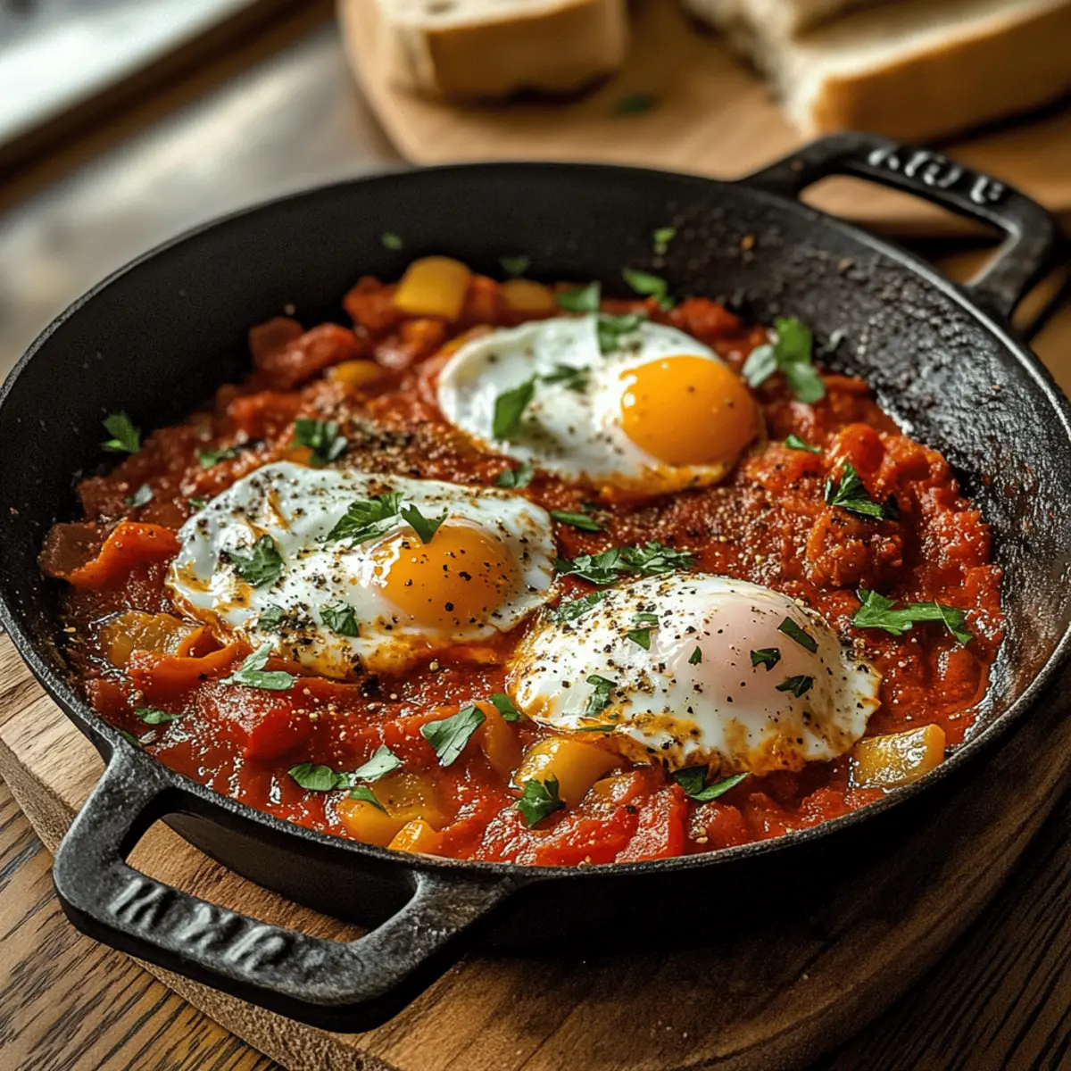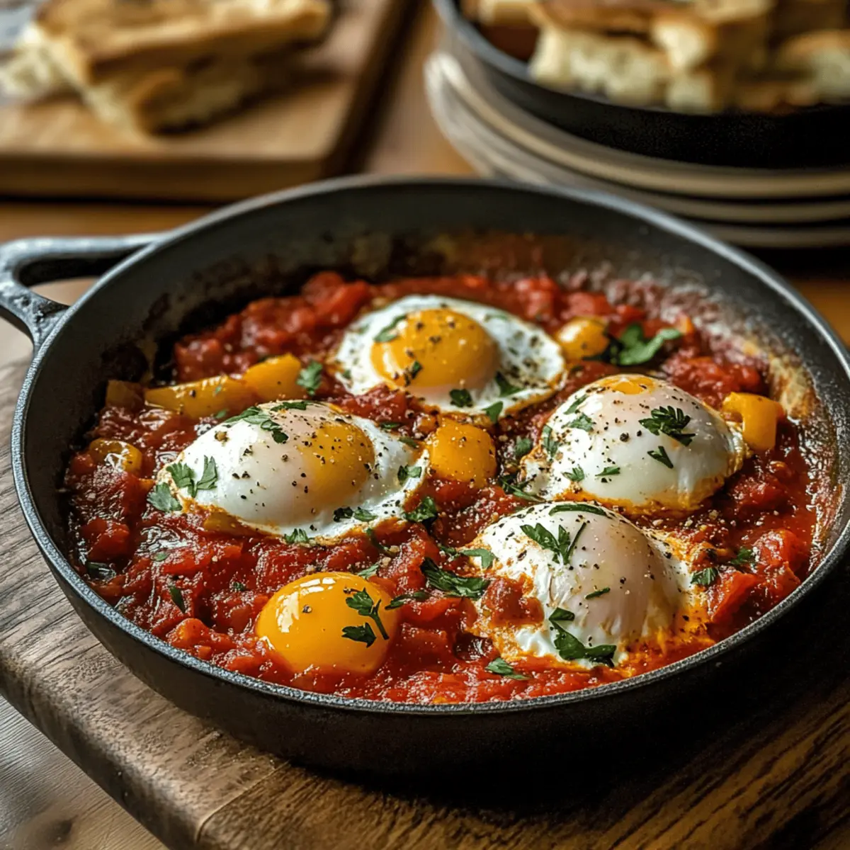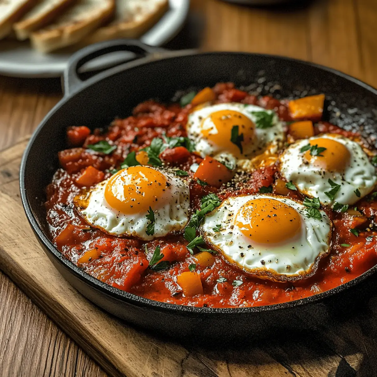 Once the eggs are done to your liking, remove the skillet from heat. Generously sprinkle chopped fresh parsley or cilantro over the top for a pop of color and freshness. Serve your Classic Shakshuka hot, ideally with crusty bread or warm pita to soak up all that delicious sauce.