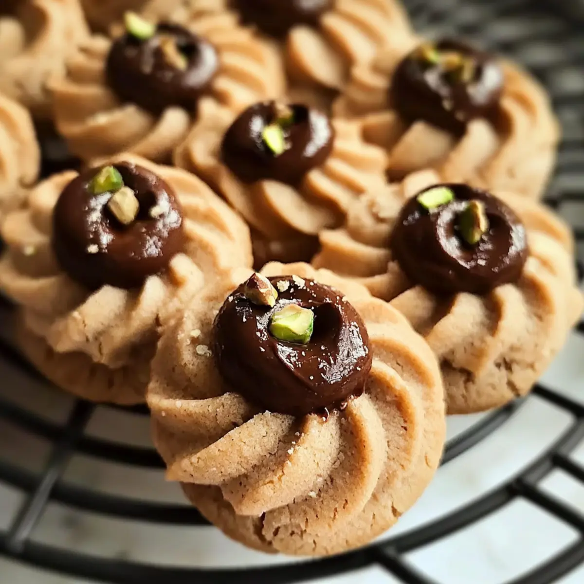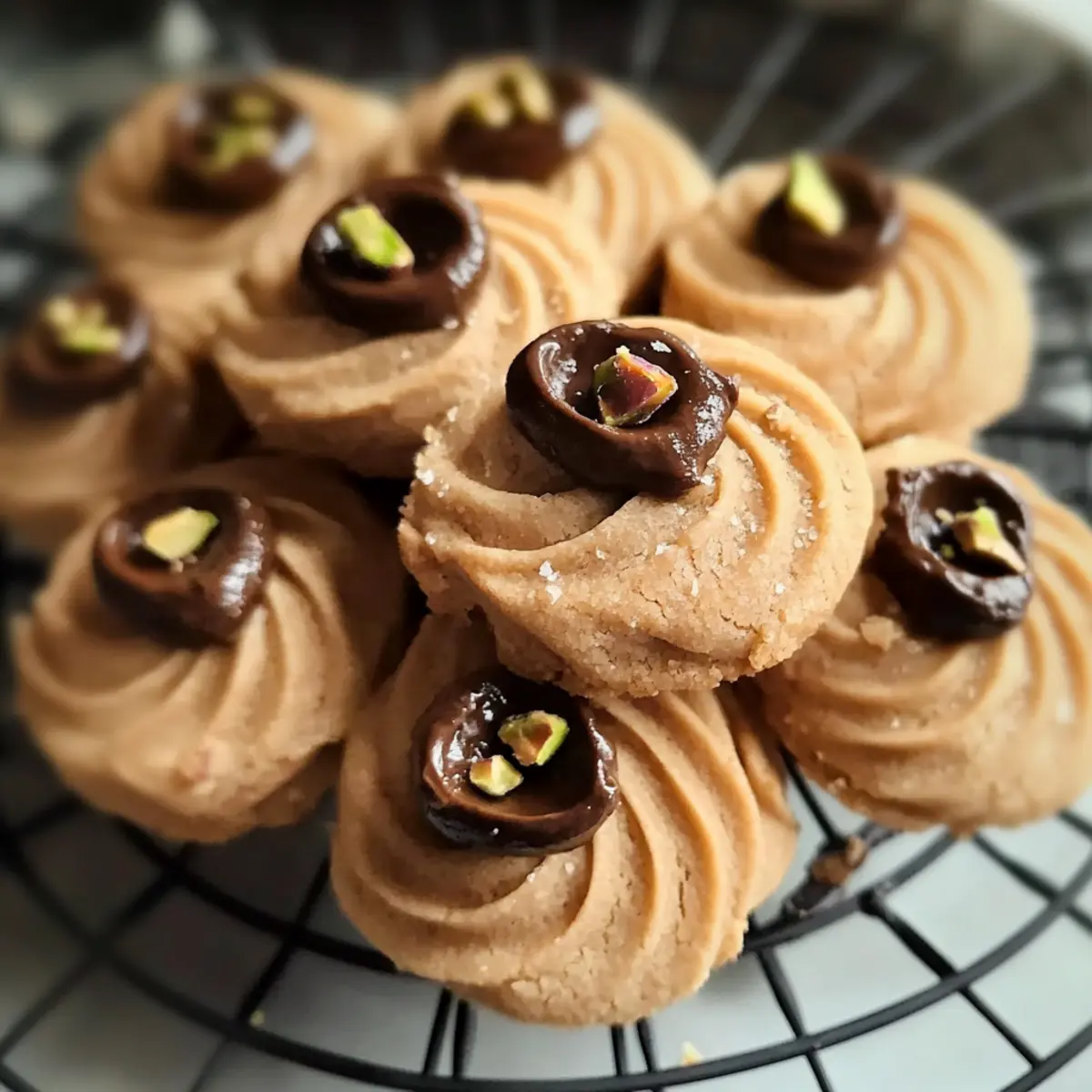 - Allow cookies to cool, then dip edges in melted dark chocolate and sprinkle with chopped pistachios.