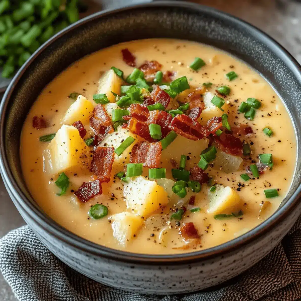 - Ladle the soup into bowls and garnish generously with crumbled bacon, additional cheddar cheese, and sliced green onions.