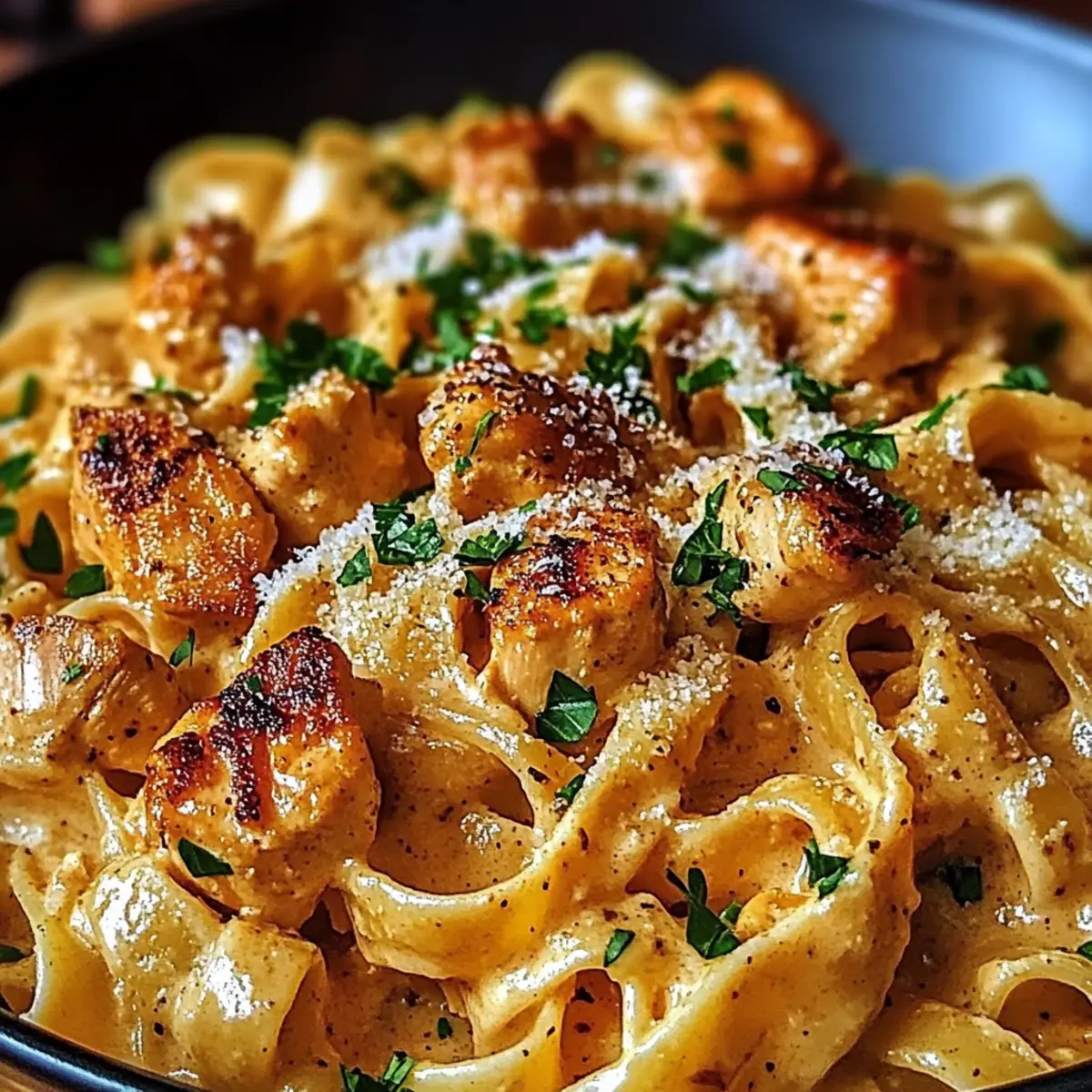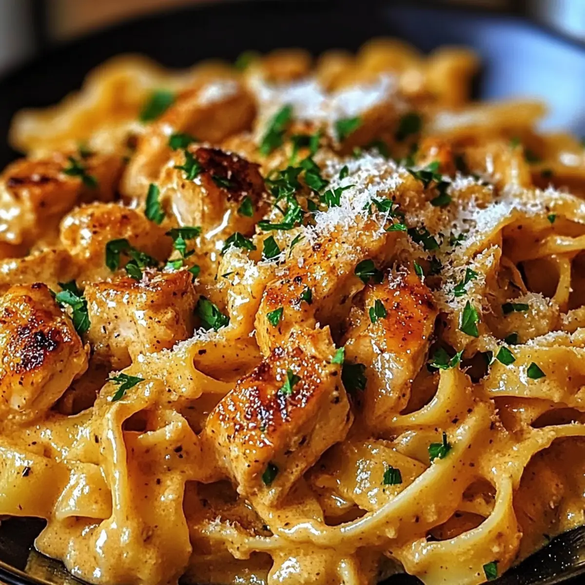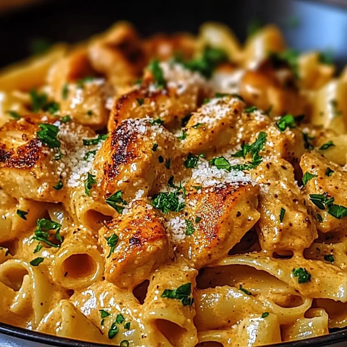 Finally, sprinkle a generous amount of grated Parmesan cheese over the top, letting it melt into the warm pasta for added richness. Turn off the heat, and garnish with freshly chopped parsley for a vibrant finish. Your Cowboy Butter Chicken Pasta is now ready to serve and share!