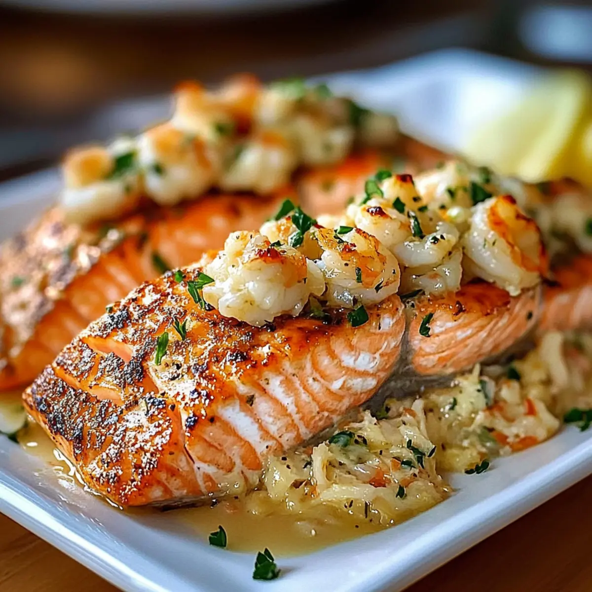 Once baked, carefully remove the skillet from the oven and let the salmon cool slightly for a few minutes. This resting period helps to set the filling. Serve the Crab Shrimp Stuffed Salmon with fresh lemon wedges, allowing guests to squeeze some zesty flavor over their dish, elevating the entire seafood experience right to the table.