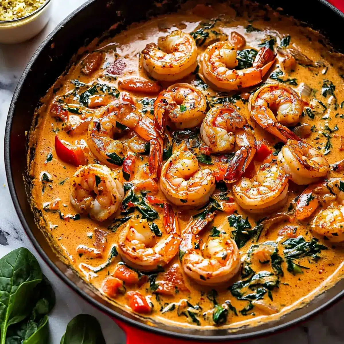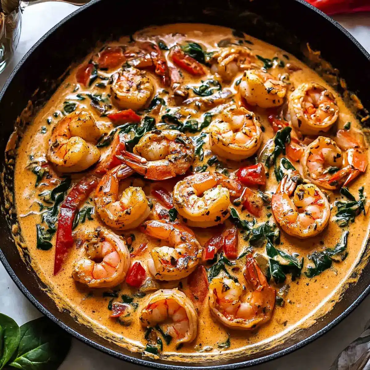 Stir in the paprika and add the fresh spinach, cooking for about 2 minutes until the spinach wilts down beautifully. The vibrant green will complement the shrimp and create a lovely contrast in your Creamy Garlic-Paprika Shrimp Skillet.