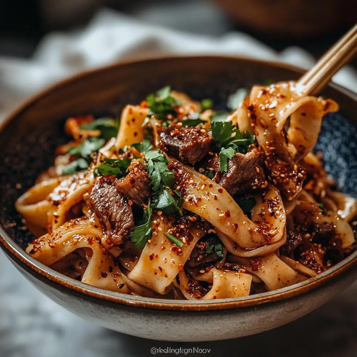 Divide the cooked noodles into serving bowls, then generously top with the succulent lamb and sauce mixture. Garnish with fresh cilantro leaves for added brightness and serve immediately with additional chili oil or vinegar on the side, if desired. Your delightful Cumin Lamb Noodles are now ready to impress!