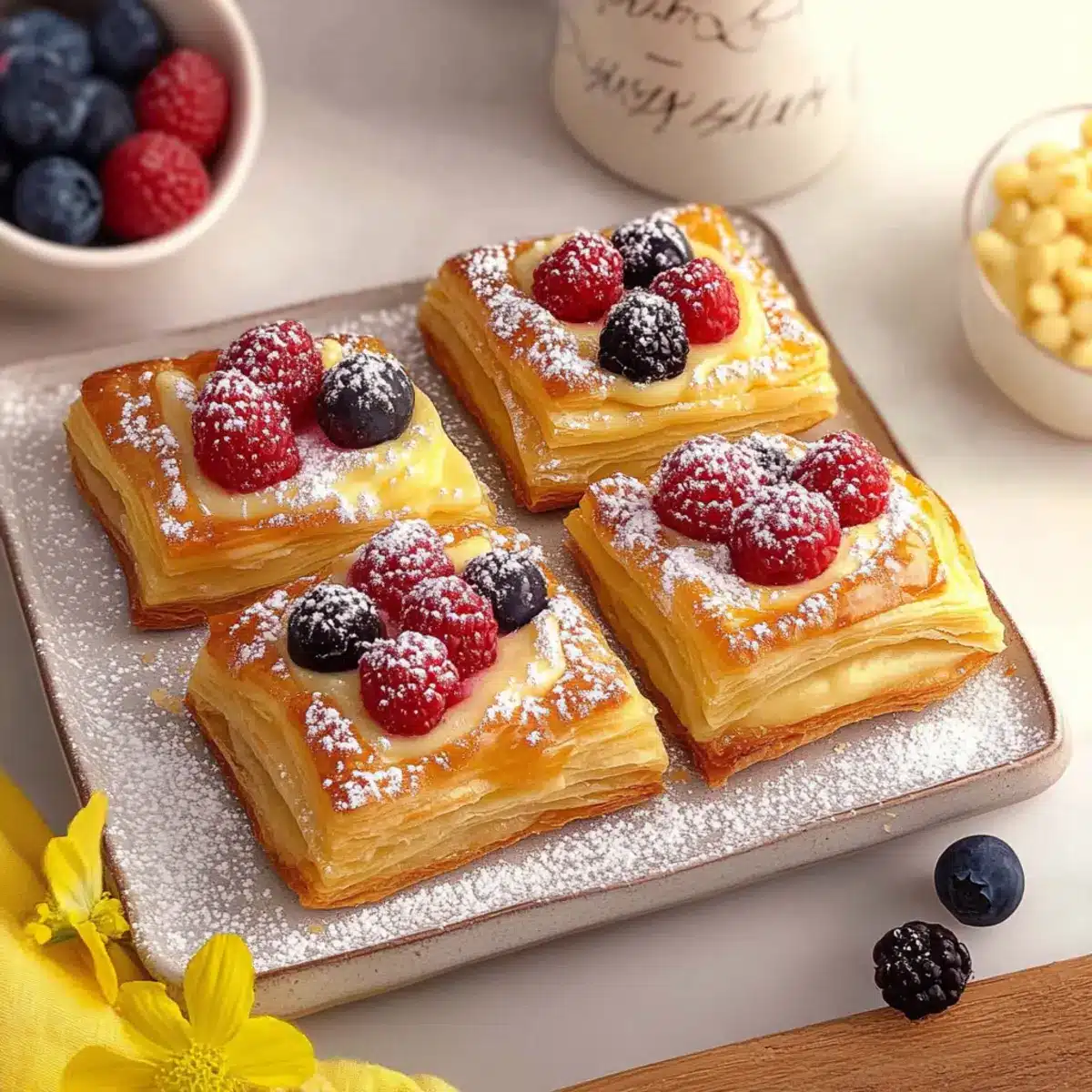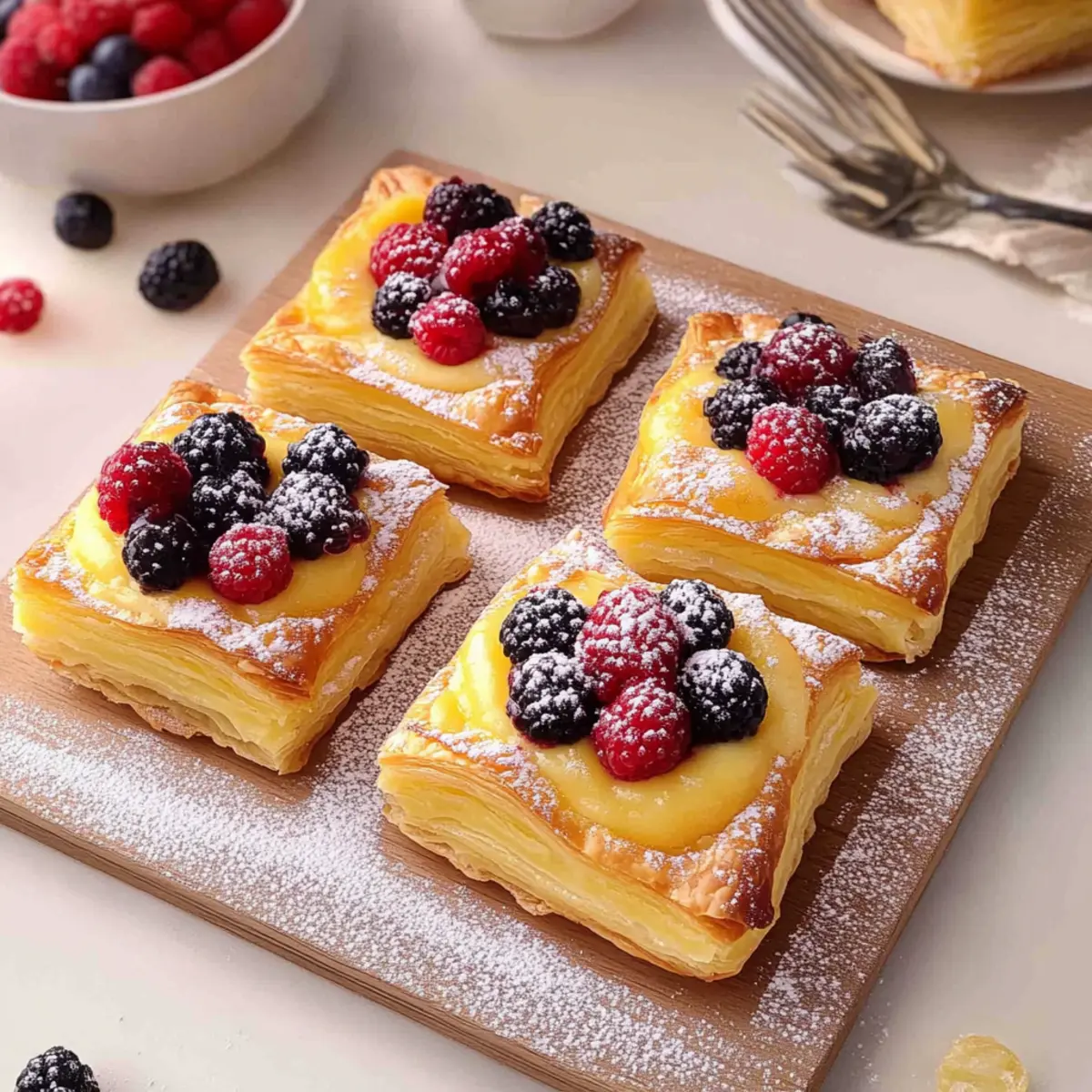 Fresh Berries: Add color and a tart contrast to the sweetness of the pastries; berries such as raspberries or blueberries brighten the dish.