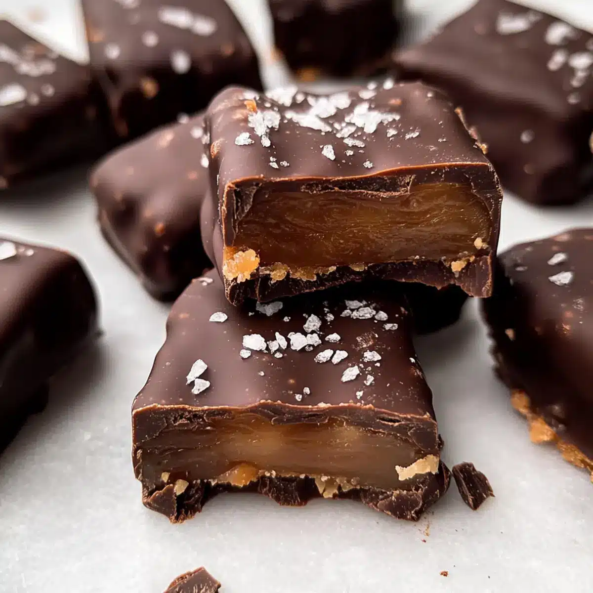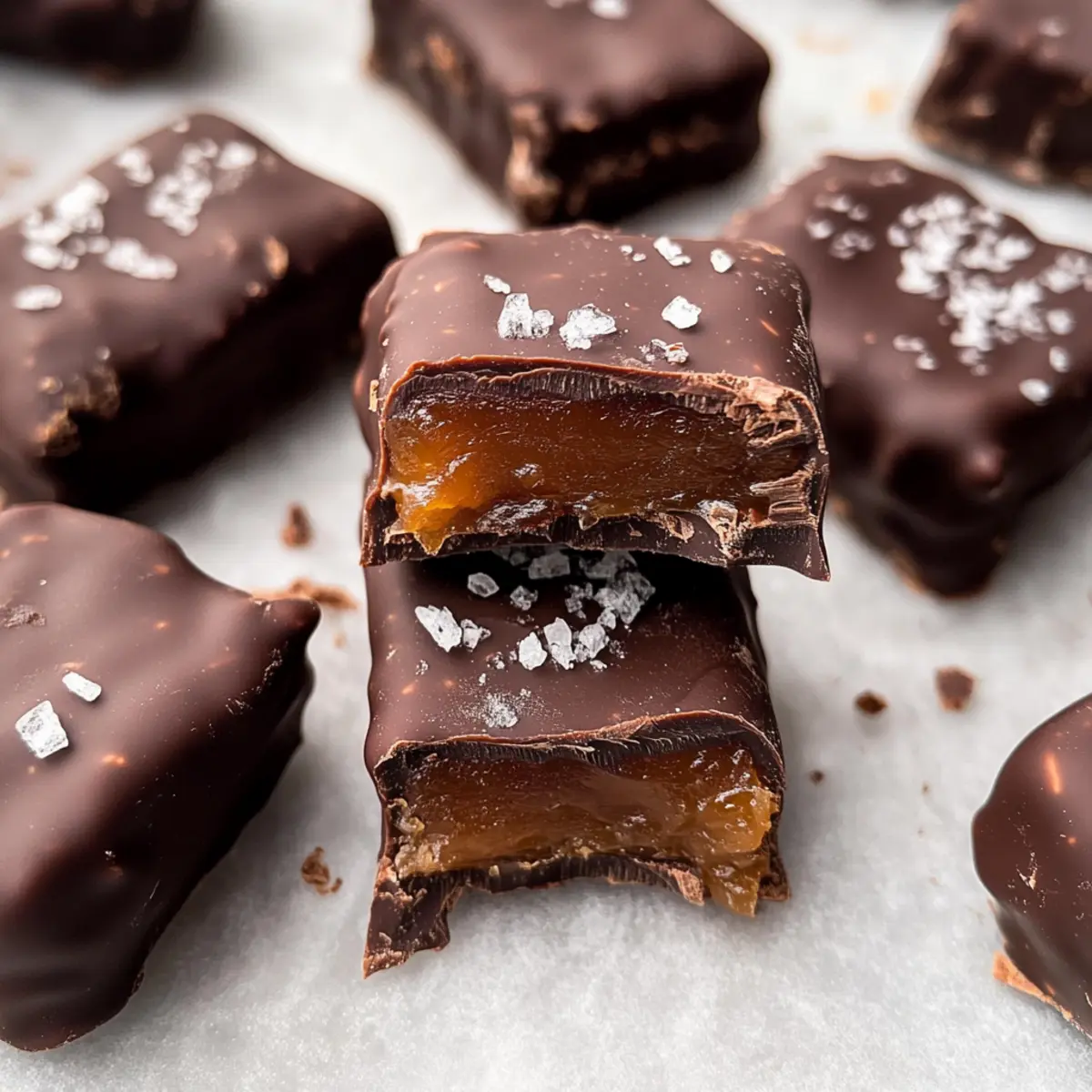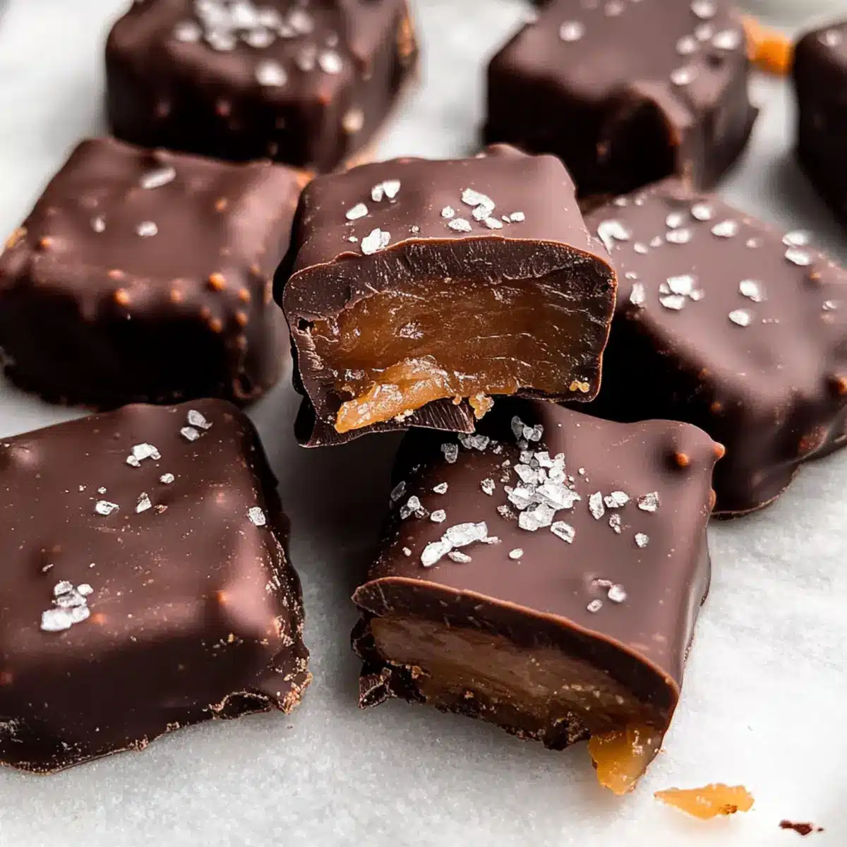 - Coat the Caramels: Dip each caramel square into the melted chocolate and place on a parchment-lined plate.