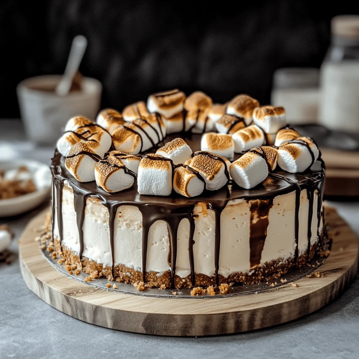 - Prepare ganache by heating equal parts heavy cream and chocolate chips in a saucepan. Once the cheesecake is chilled, pour ganache over the top and arrange marshmallows for toasting.
