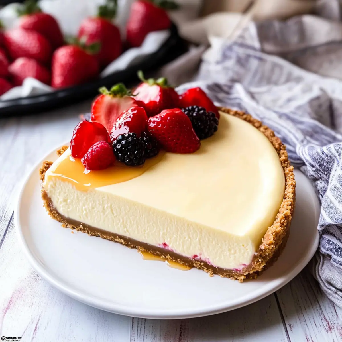 Fresh Berries: Juicy strawberries or blueberries add a refreshing burst that contrasts beautifully with the cheesecake’s rich texture.