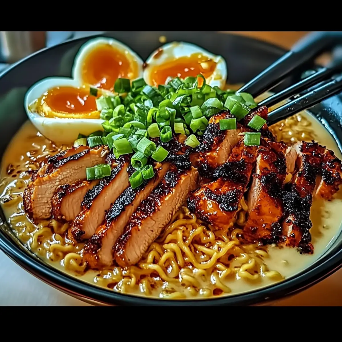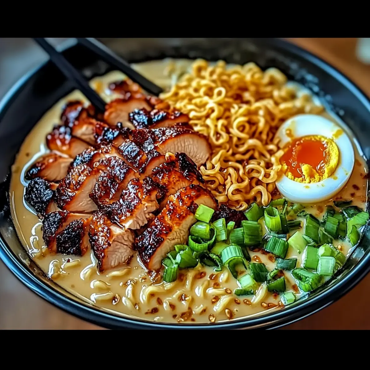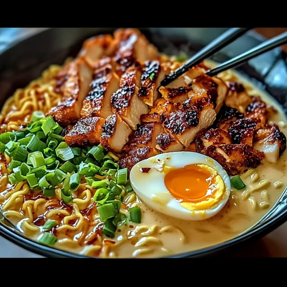 - To plate, divide cooked ramen noodles among bowls. Spoon creamy garlic sauce over noodles, top with chicken pieces, and garnish with green onions, carrots, a soft-boiled egg, sesame seeds, and nori strips.