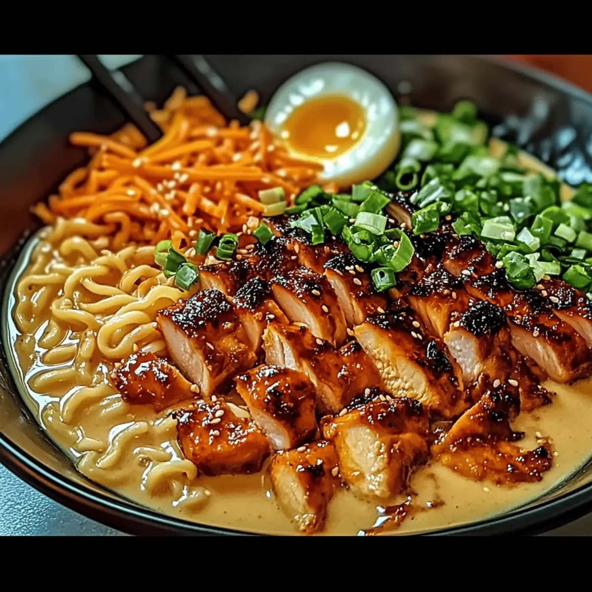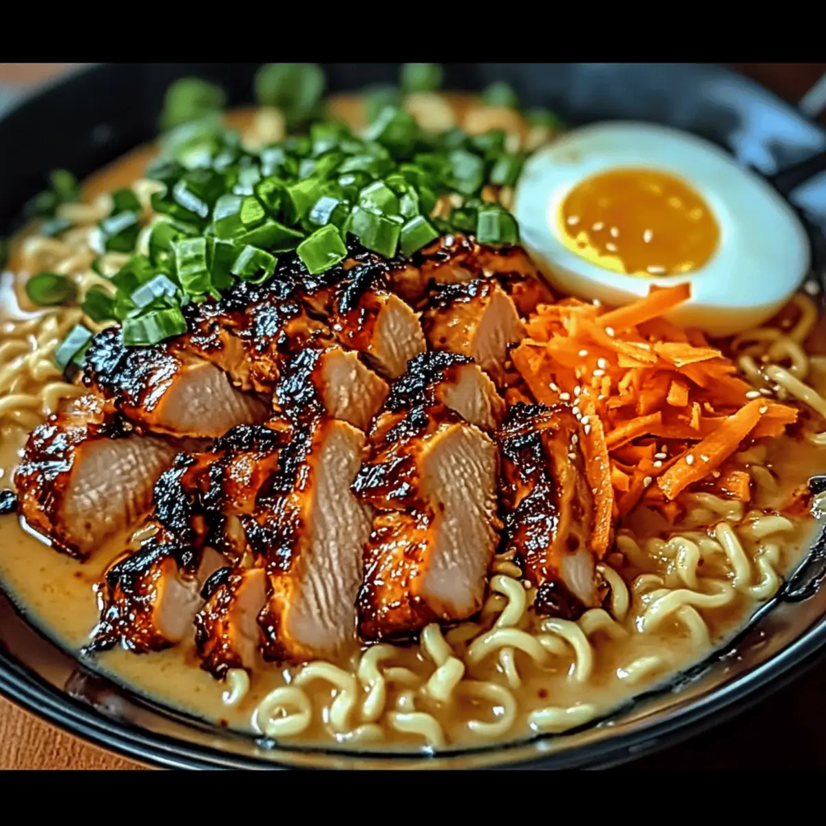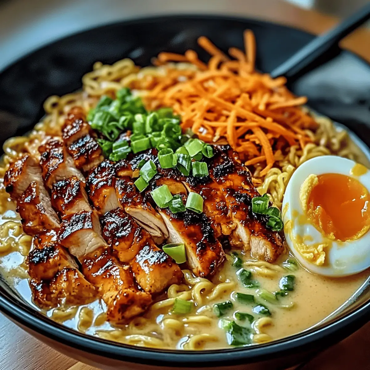 To assemble your Fiery Chicken Ramen, divide the cooked noodles among serving bowls. Generously ladle the creamy garlic sauce over the noodles, then top with the crispy chicken strips. Add fresh green onions and optional shredded carrots for color and crunch. For an extra touch, include a halved soft-boiled egg and sprinkle with sesame seeds and nori strips.