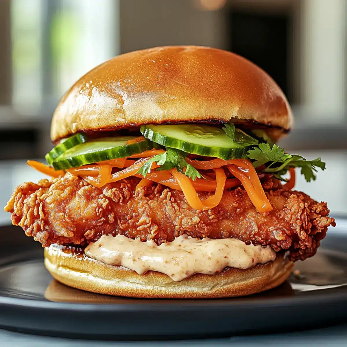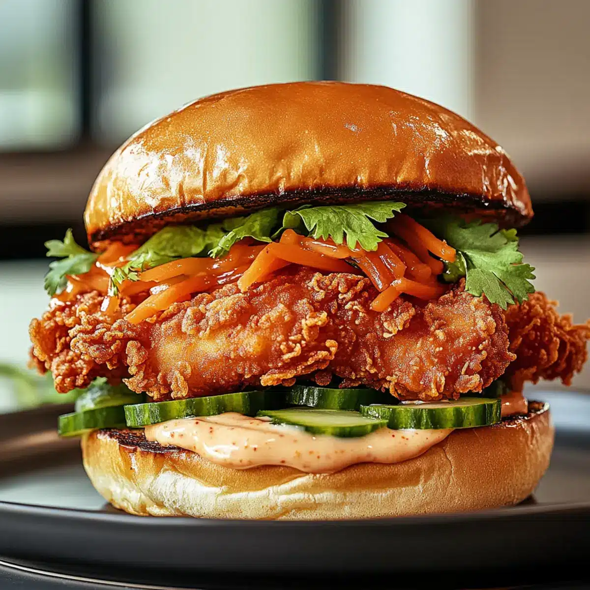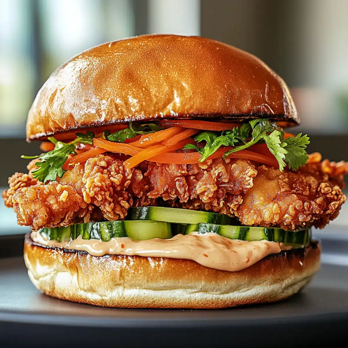 - Toast buns until golden, then spread a generous layer of the chili mayo on each half. Layer the fried chicken, cucumber slices, pickled carrots, and fresh herbs on the bottom bun, then place the top bun and serve.