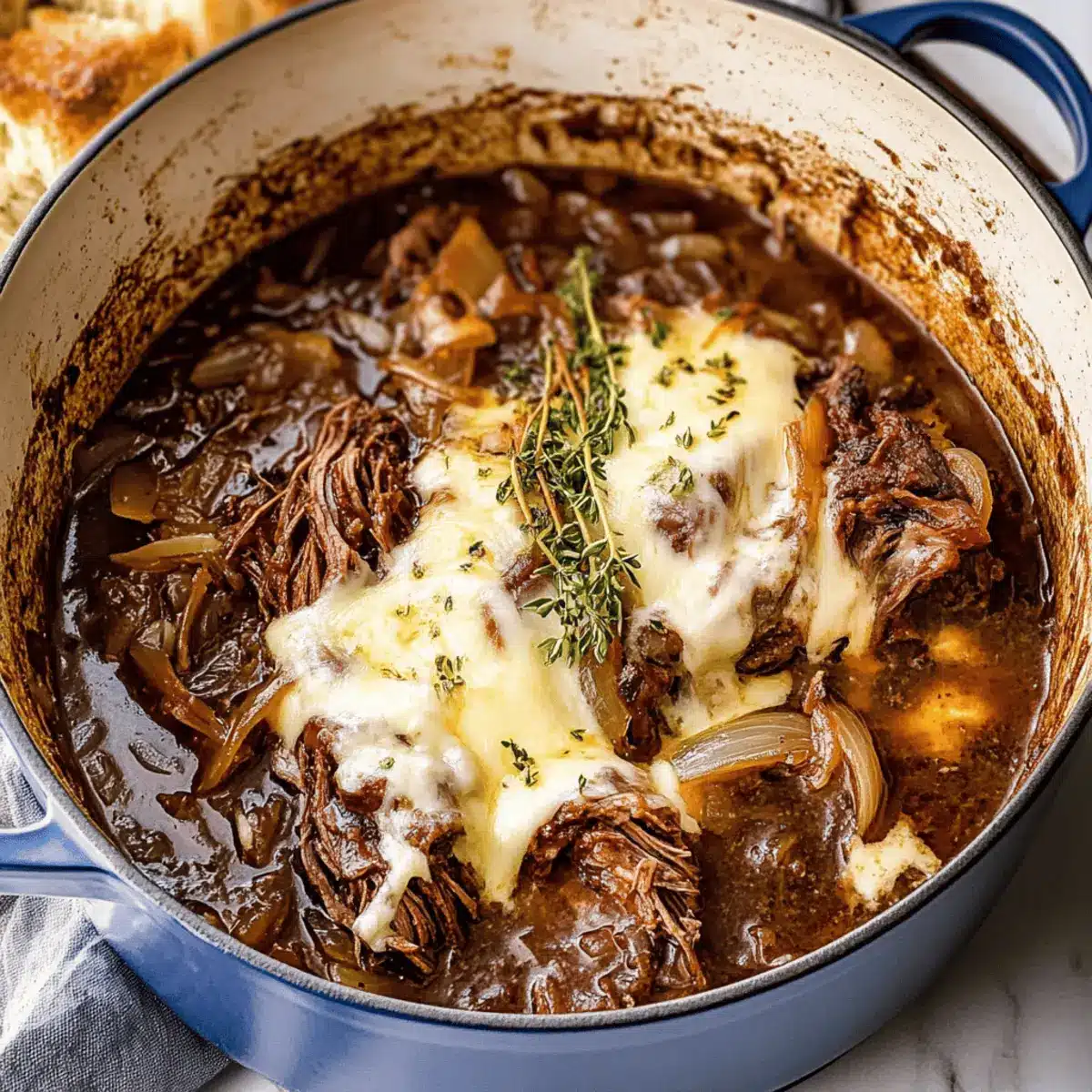 - Increase oven temperature to 400°F (200°C). Return shredded beef to the pot, top with Gruyere cheese, and bake for 5-7 minutes until melted and bubbly.