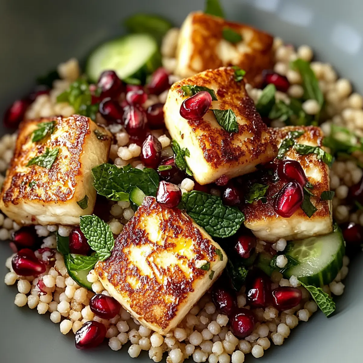 Finally, arrange the crispy fried halloumi slices atop the salad for a stunning presentation. You can serve this Halloumi & Pomegranate Couscous Salad warm or chilled, making it a versatile dish for any occasion. Enjoy the vibrant colors and delightful textures as you dig into this refreshing meal!