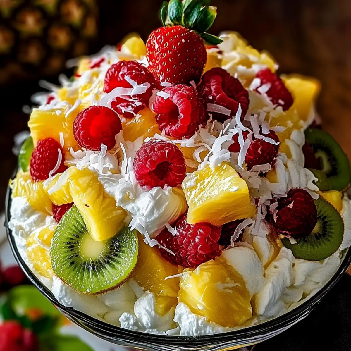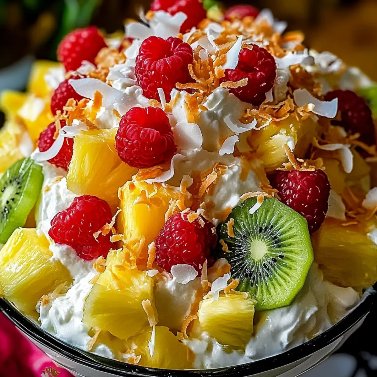 Bring out your colorful selection of fruits for this tropical delight. Rinse and thoroughly dry 1 cup each of strawberries, pineapples, and raspberries. Hull and halve the strawberries, slice kiwis, and ensure pineapple chunks are well-drained if canned. Set the prepared fruits aside, ready to add a burst of flavor to your creamy mixture.