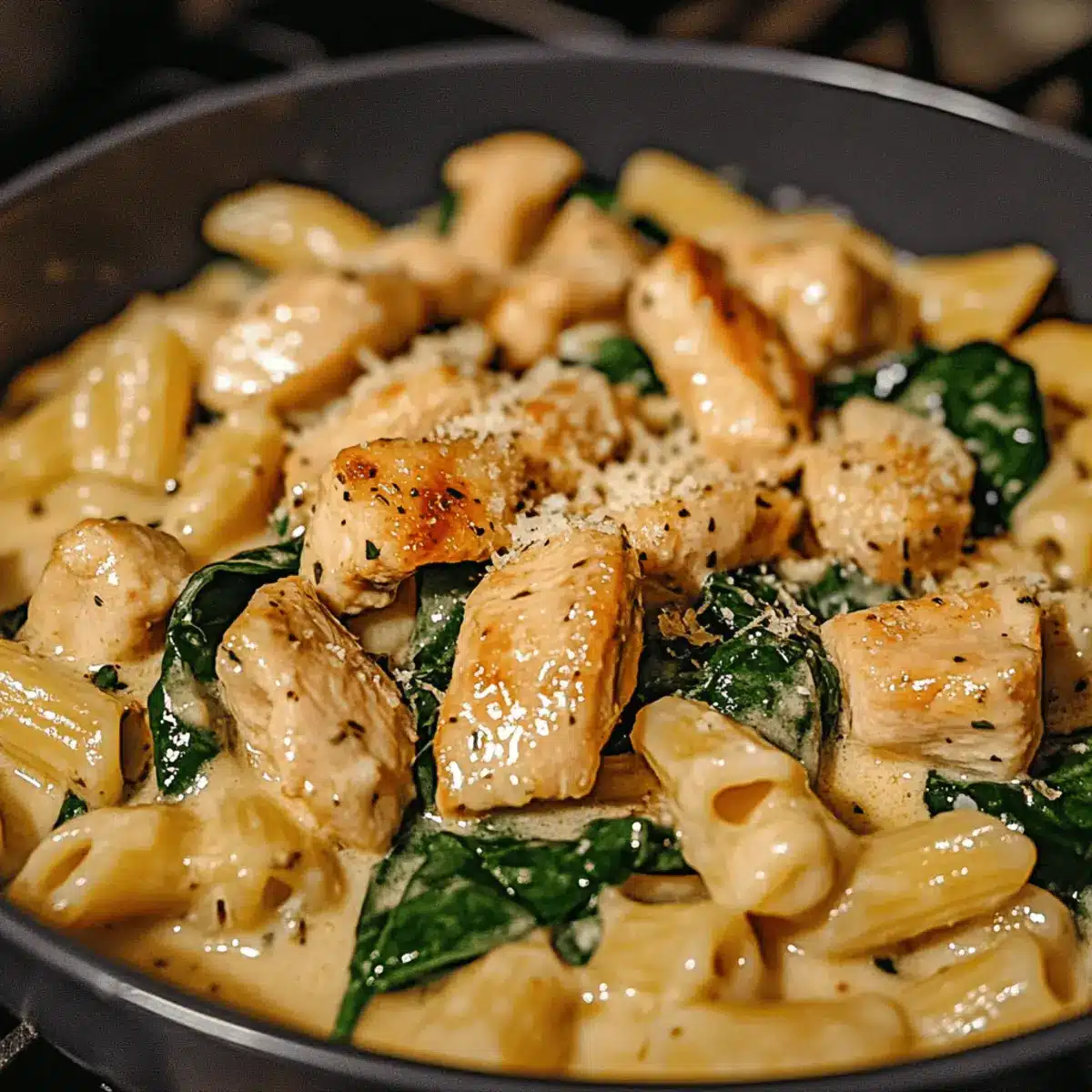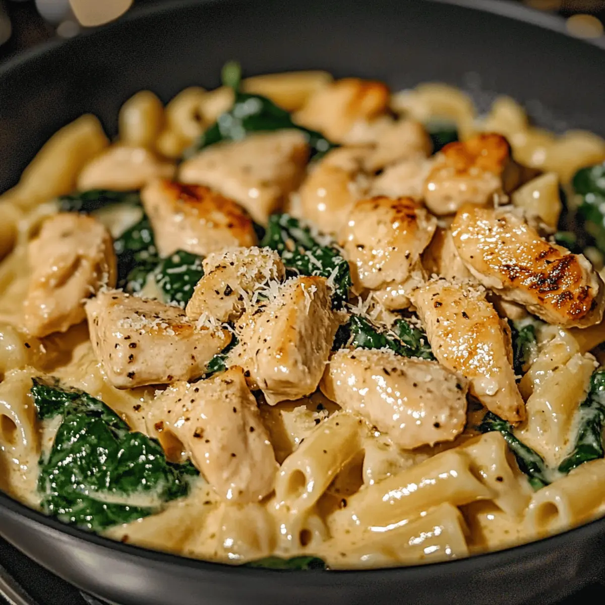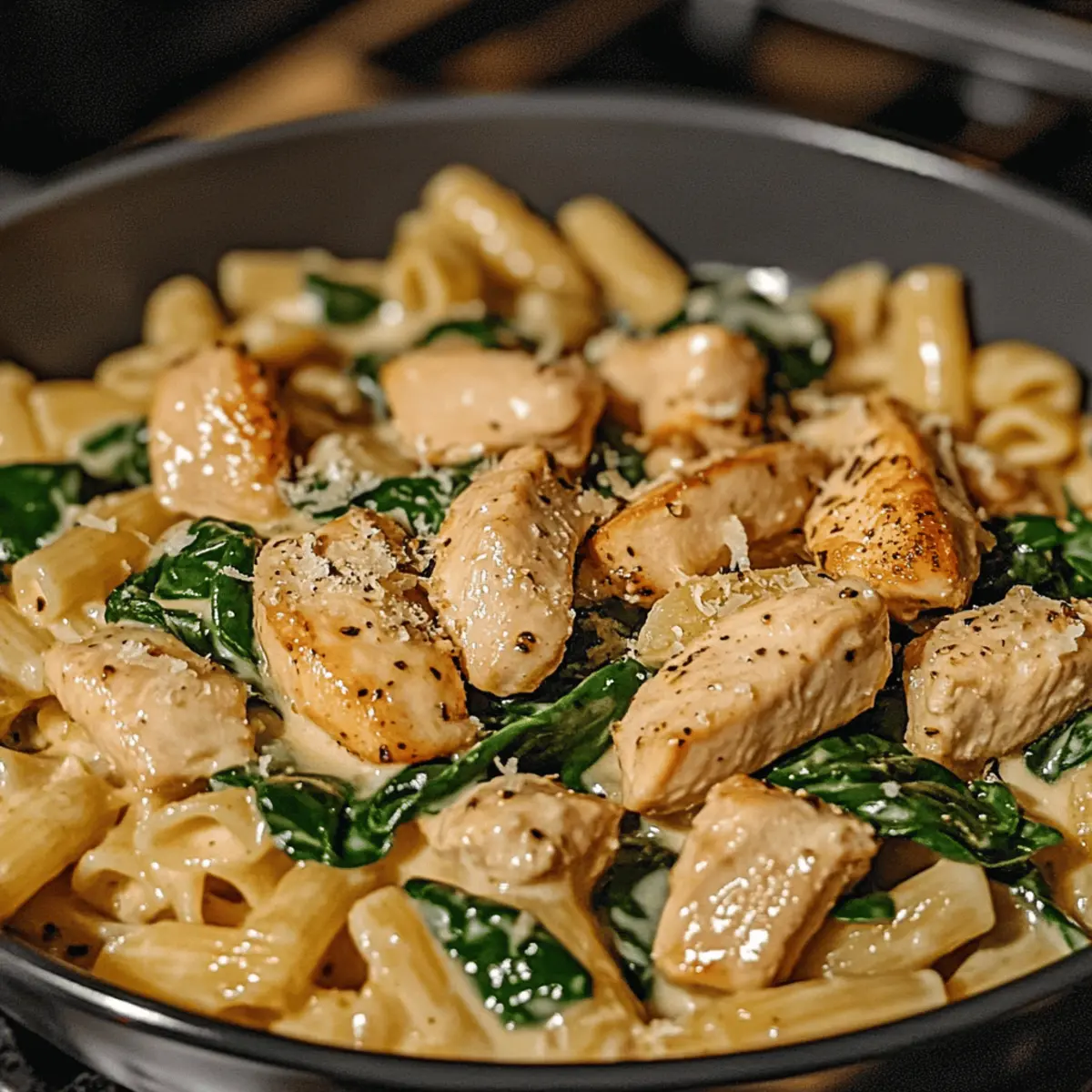 - Combine cooked chicken and any optional spinach into the sauce. Fold in drained pasta until well coated. Adjust seasoning with extra salt and pepper if needed. Serve immediately, garnished with more Parmesan cheese.