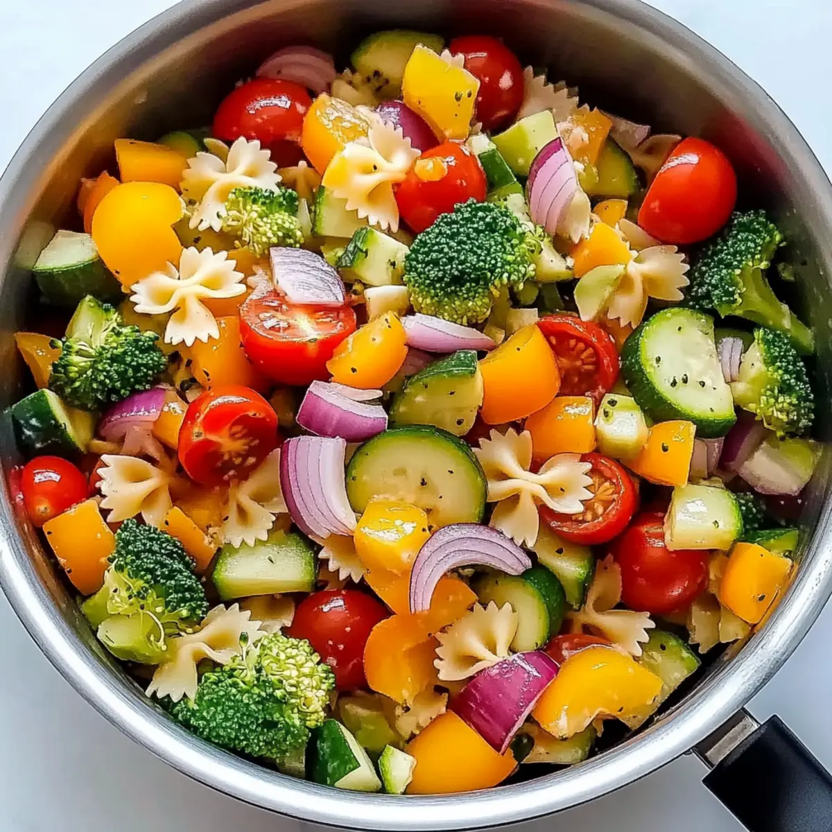 - Combine Ingredients: Add sautéed vegetables to cooled pasta, drizzle vinaigrette, and toss gently.