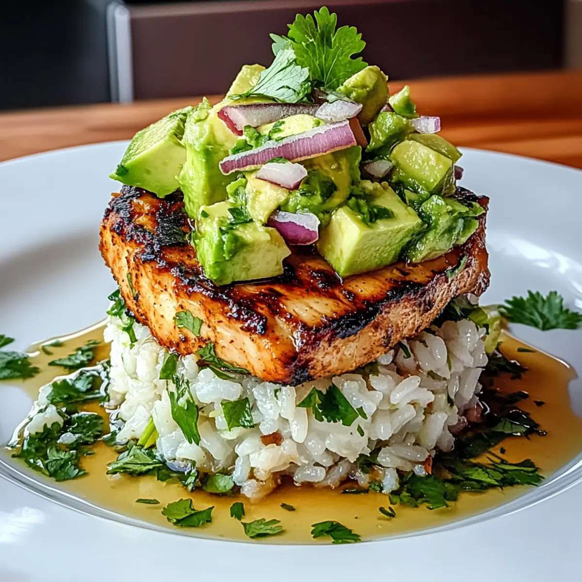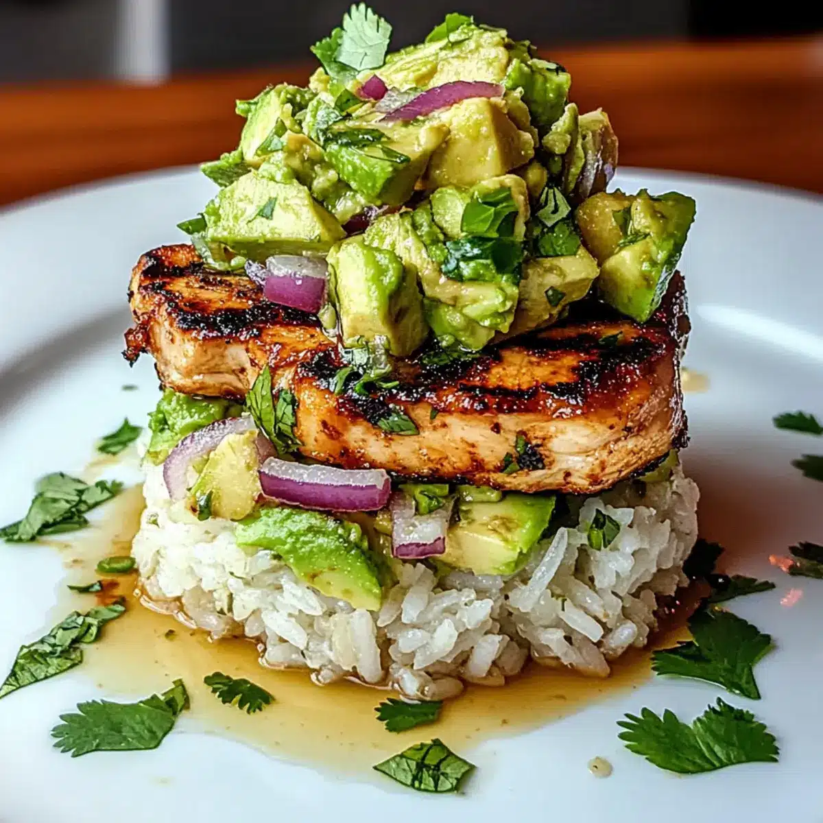 Garnish the assembled stacks with fresh lime wedges and extra chopped cilantro for an added burst of flavor and color. Serve immediately while everything is warm and inviting. Your guests will love the balance of zesty chicken, creamy avocado, and fragrant rice in this delightful dish!