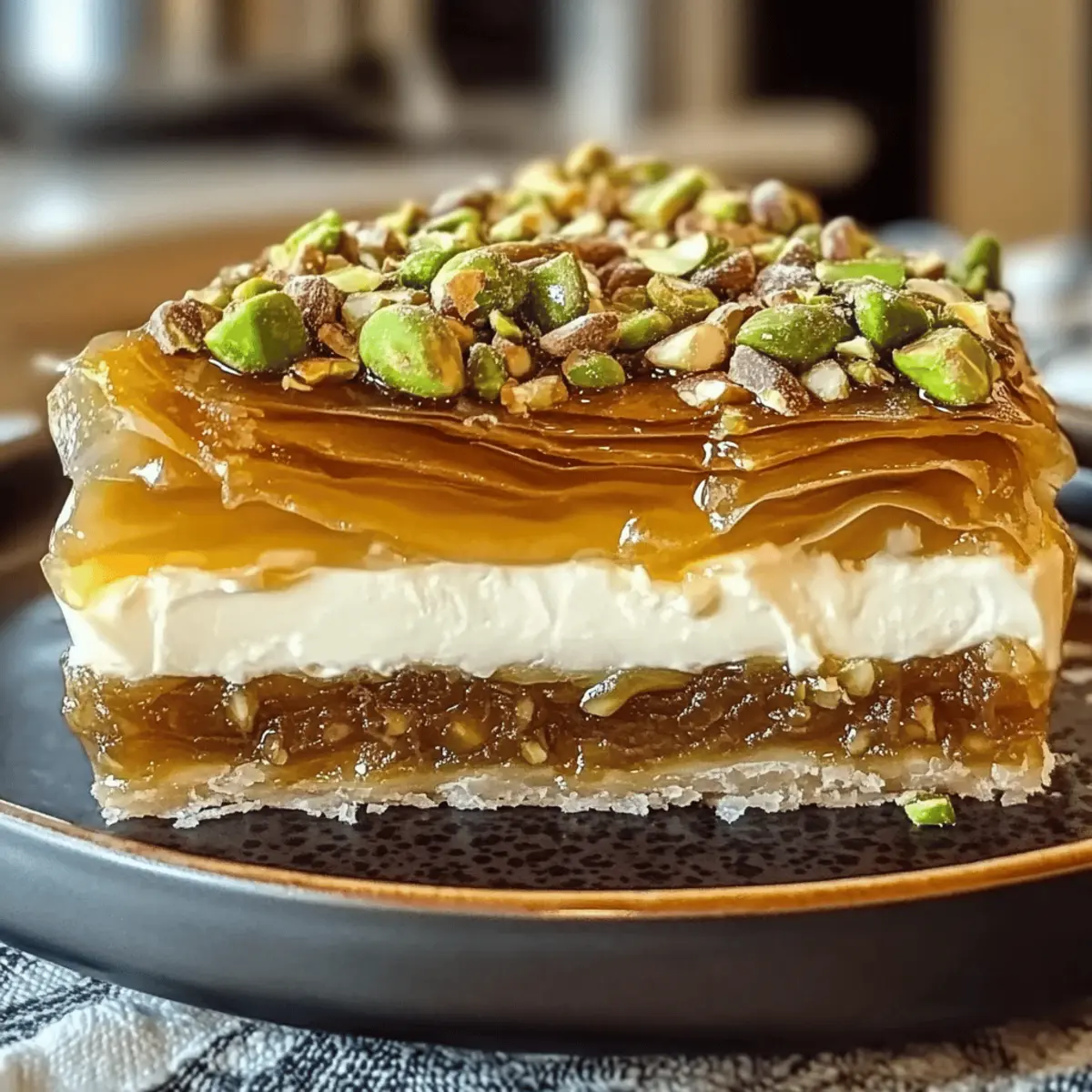 Very good question! To store your Honey Pistachio Baklava Cheesecake, wrap it tightly in plastic wrap or place it in an airtight container. It can last in the refrigerator for up to 3-4 days. However, for the best texture experience, add the honey syrup just before serving to keep the baklava layers crispy.