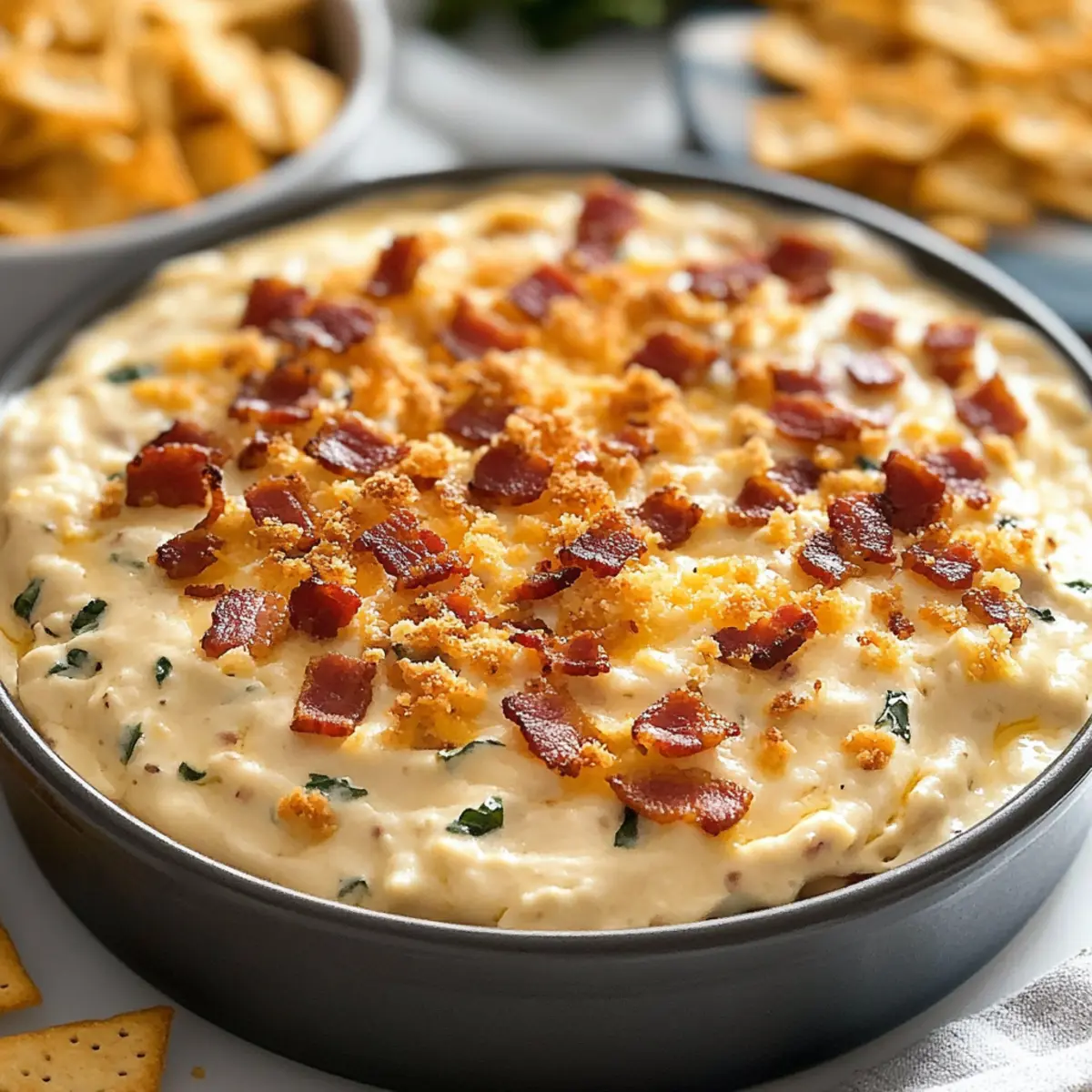 While the Hot Smoked Gouda Bacon Dip contains dairy and bacon, you can easily adjust it for dietary needs! To make it vegetarian, substitute bacon with smoked tempeh or sautéed mushrooms. Additionally, Greek yogurt can replace sour cream for a lighter touch, and use gluten-free breadcrumbs if necessary. Always check for allergies with your guests before serving!