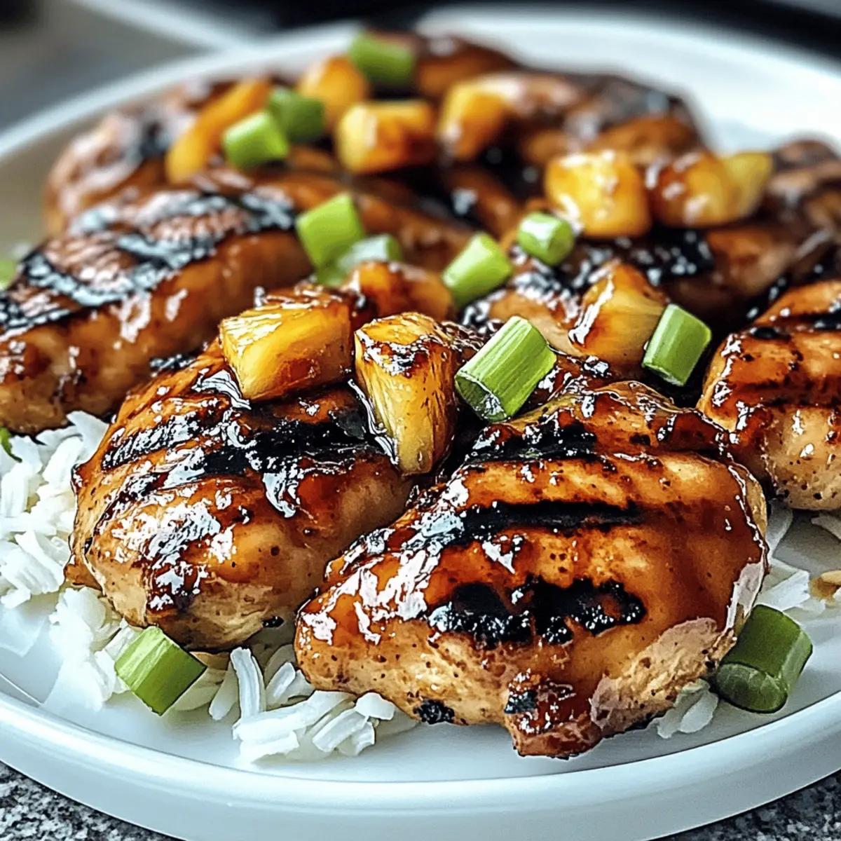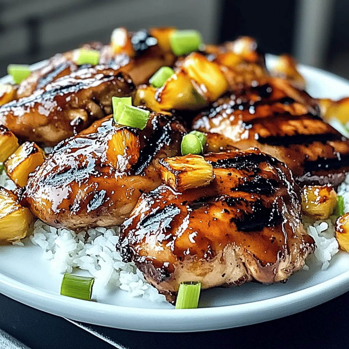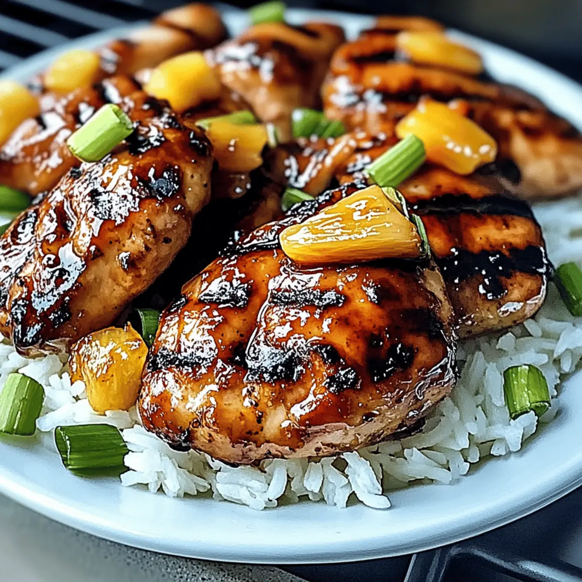 - Transfer grilled chicken to a cutting board and let rest for 3-5 minutes. Slice and serve over a bed of white rice, garnishing with green onions and optional grilled pineapple slices.