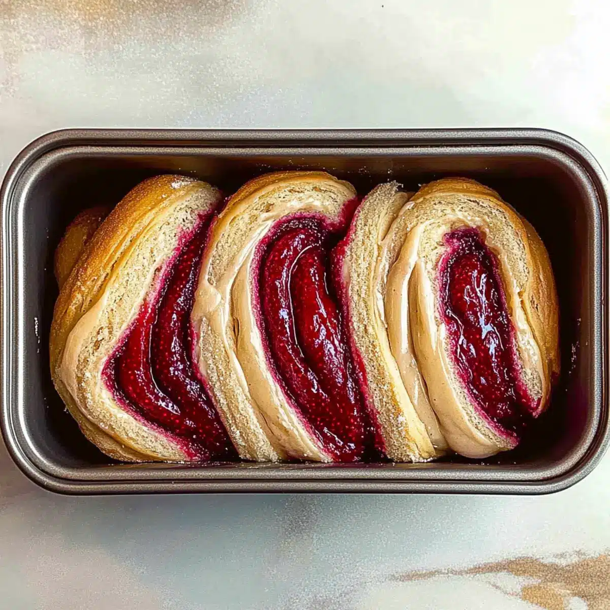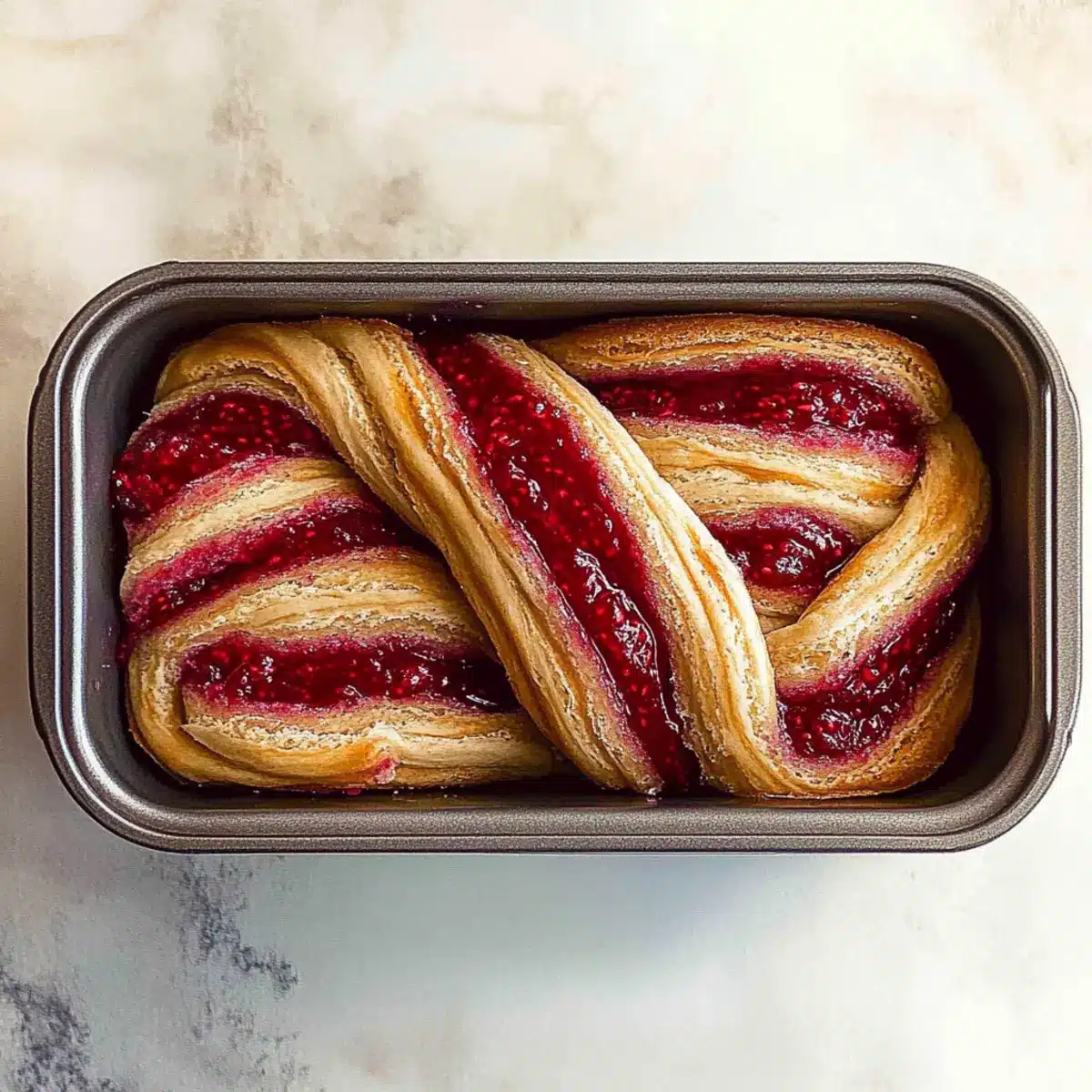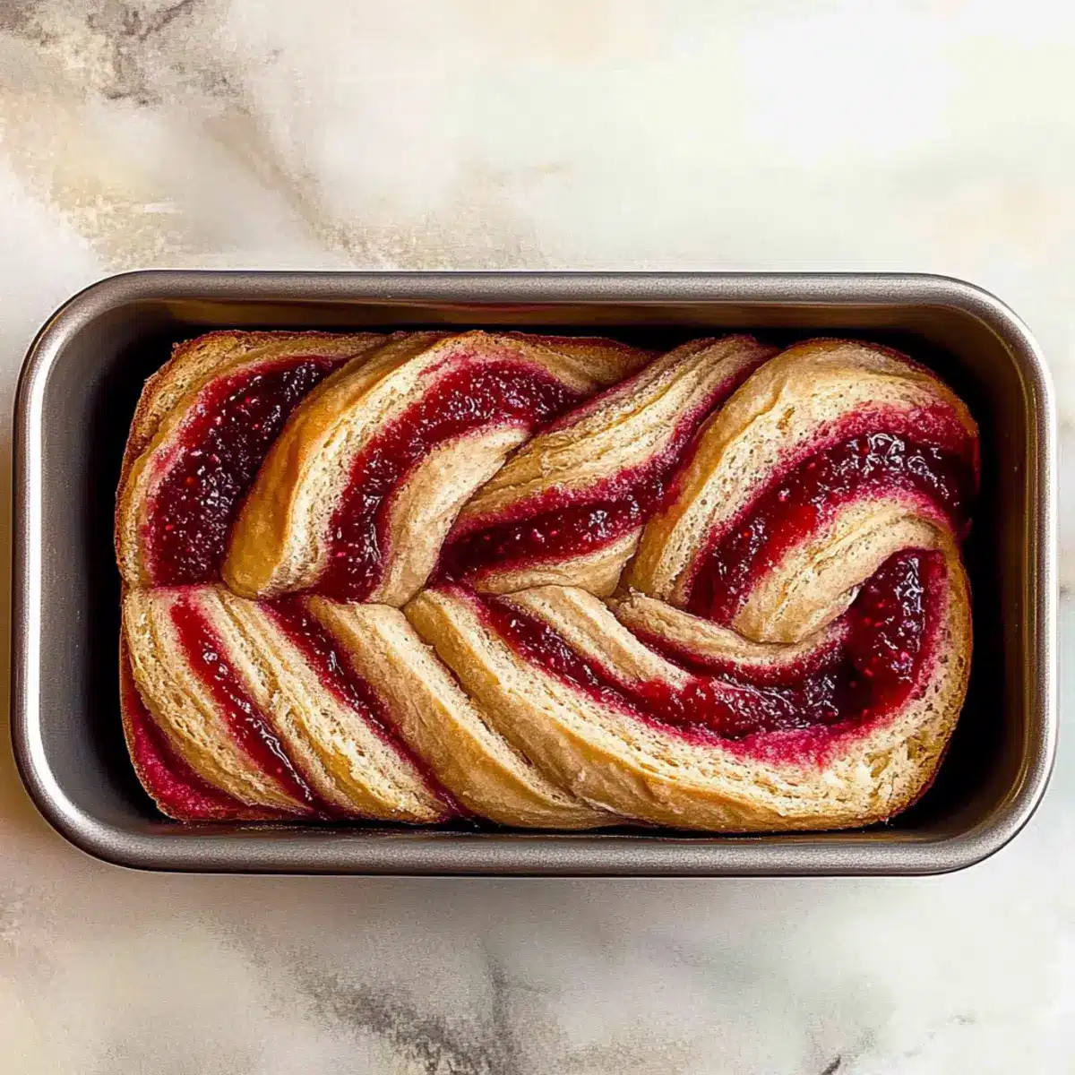 - Once the dough has risen, punch it down to release the air, then roll it out into a rectangle on a floured surface. Spread your cooled raspberry jam evenly over the surface, then carefully roll the dough into a log from one long side to the other. Cut the log in half lengthwise, twist the two halves together, and place the twisted dough into a lined loaf tin. Cover and let it rise again for 1 hour.