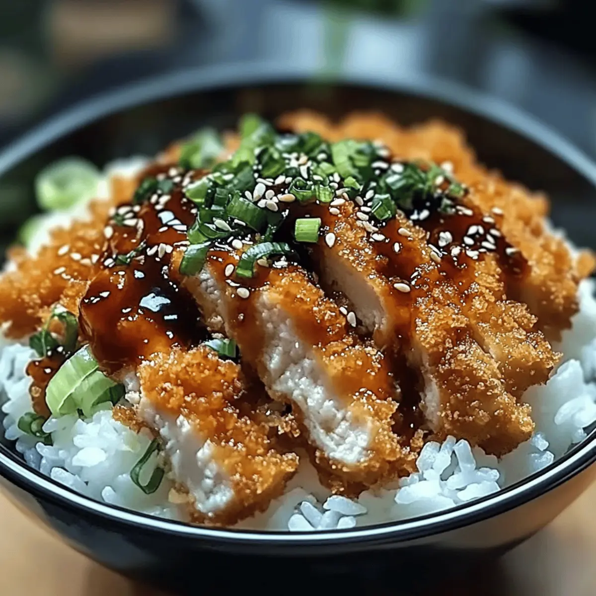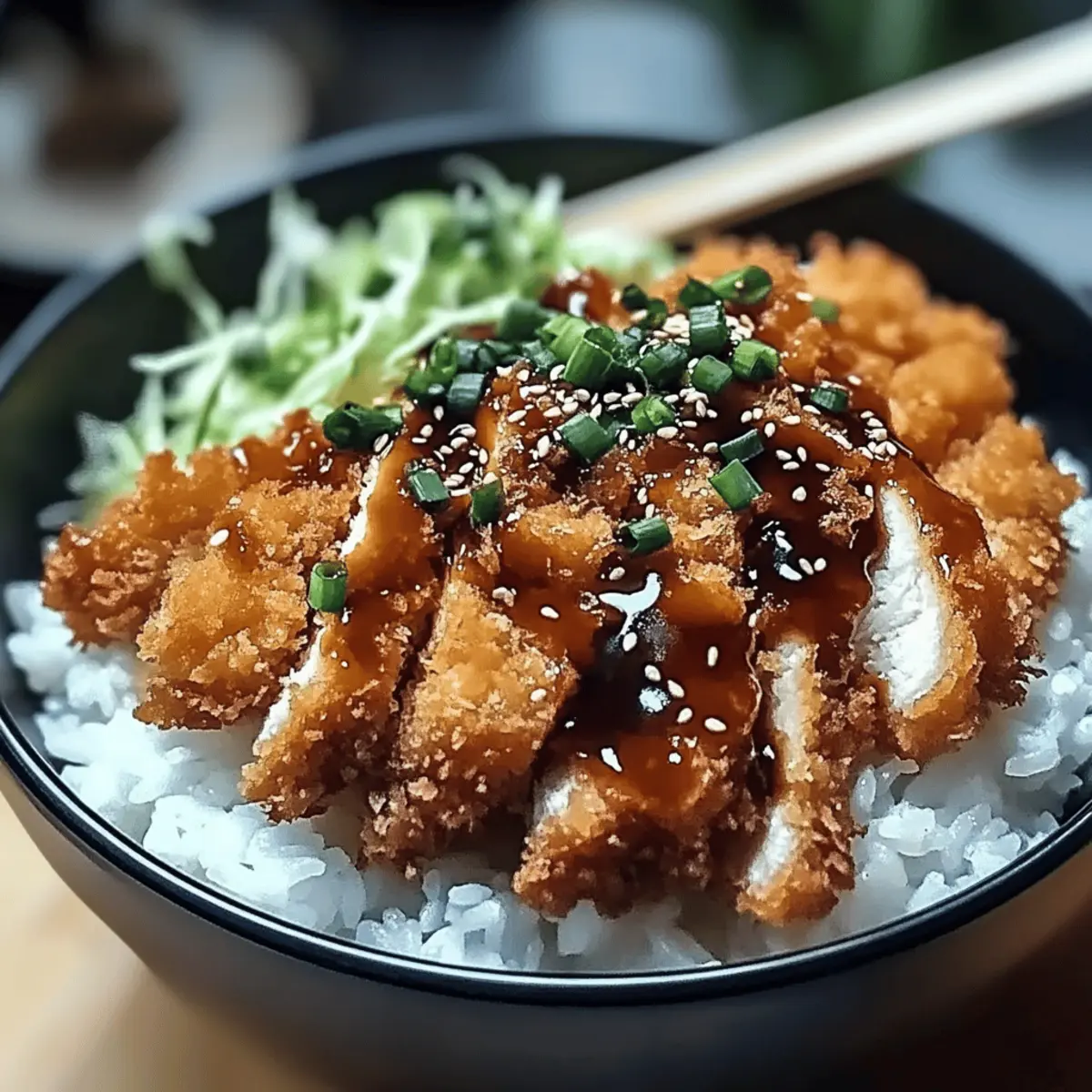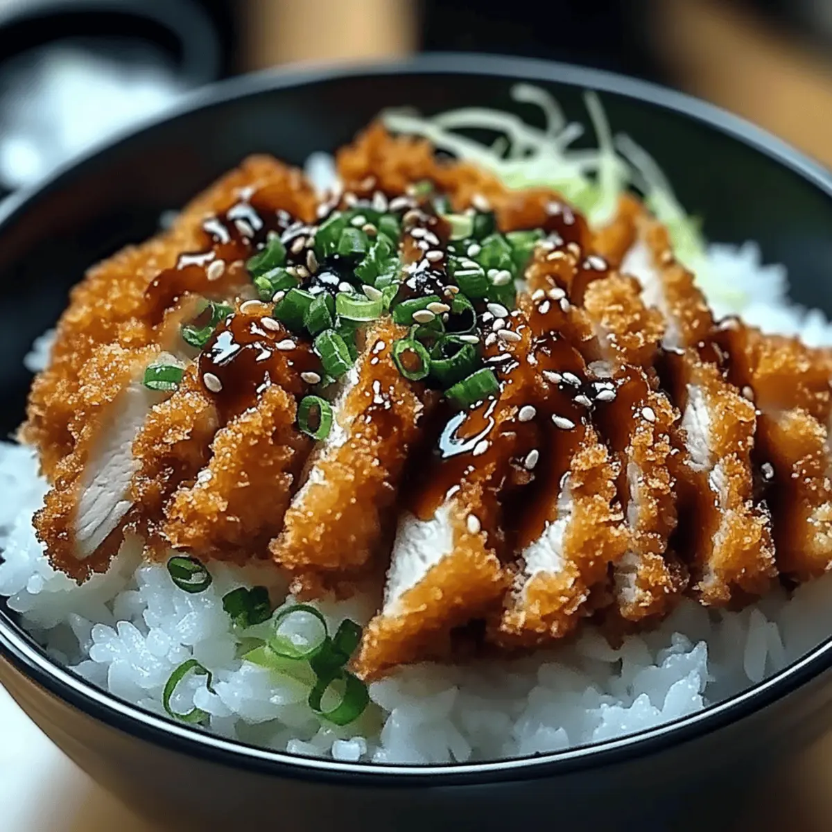 - Assemble bowls with a portion of rice, sliced katsu on top, drizzle with sauce, and add cabbage, green onions, and sesame seeds.