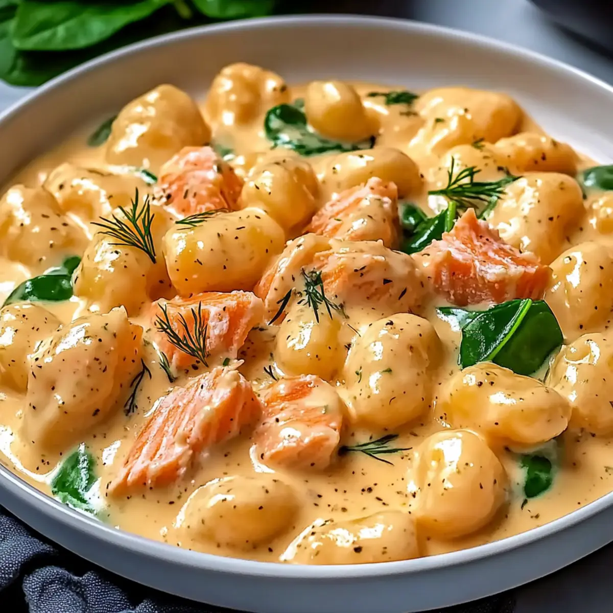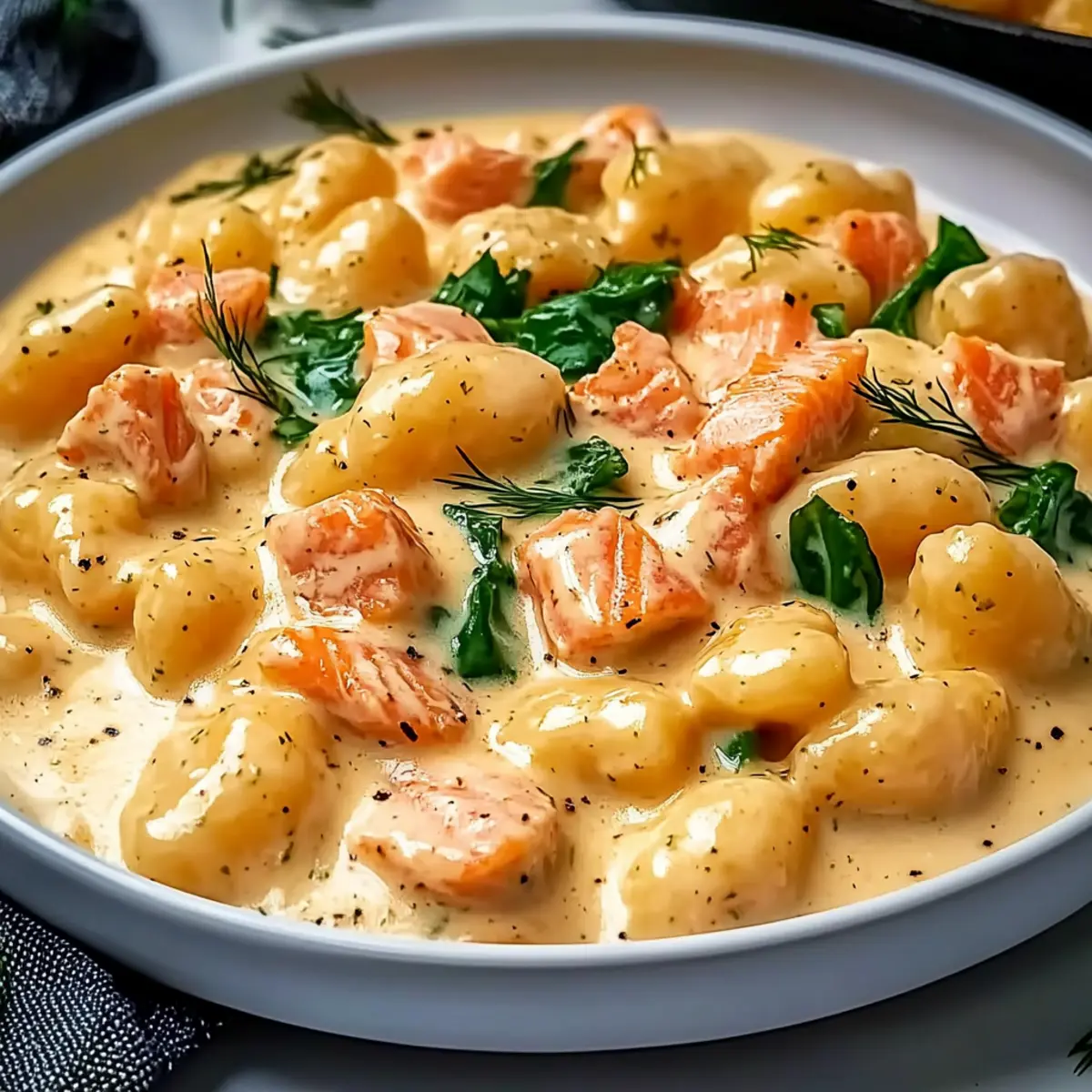 - Gently fold in the cooked gnocchi and flaked smoked salmon until evenly coated.