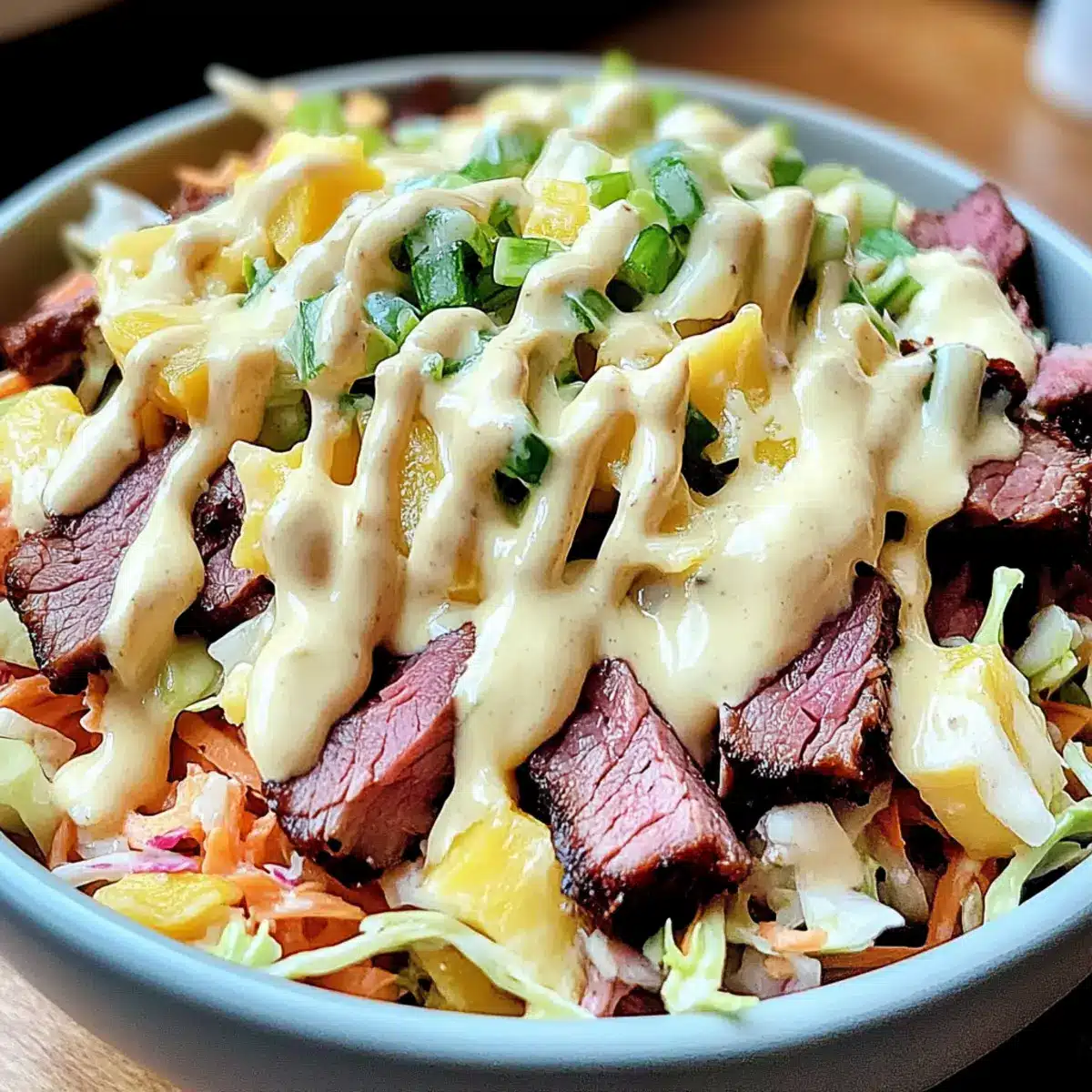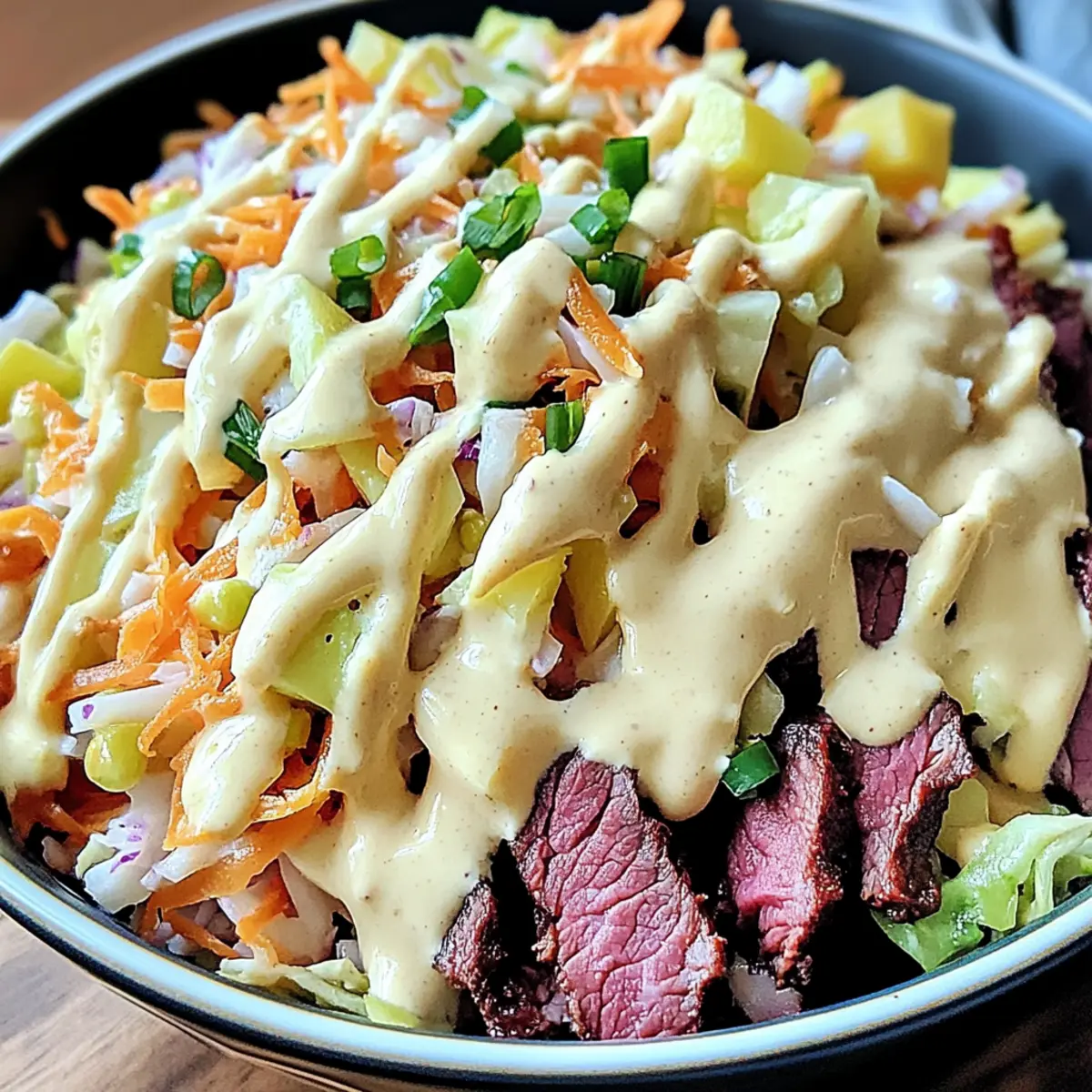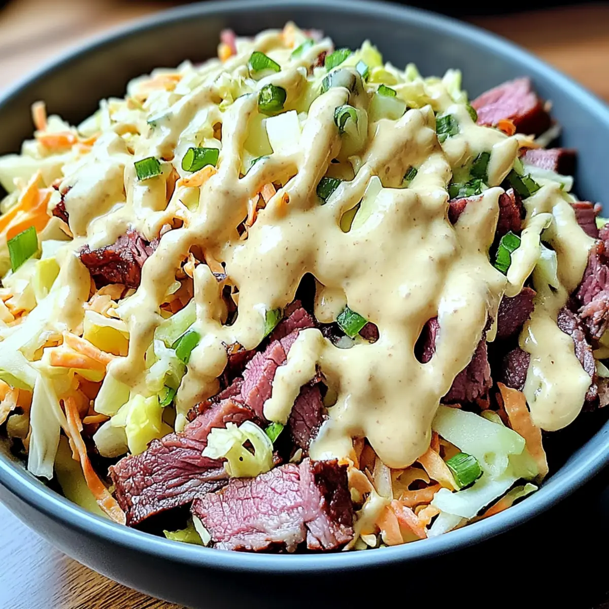 Drizzle the prepared dressing generously over the warm beef and coleslaw mixture in the skillet. Garnish with thinly sliced scallions for a pop of color and flavor. Serve immediately, enjoying each hearty bite of this satisfying bowl!