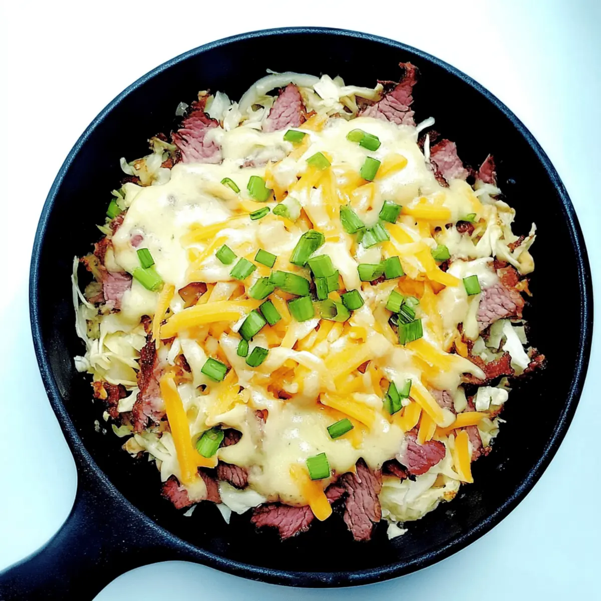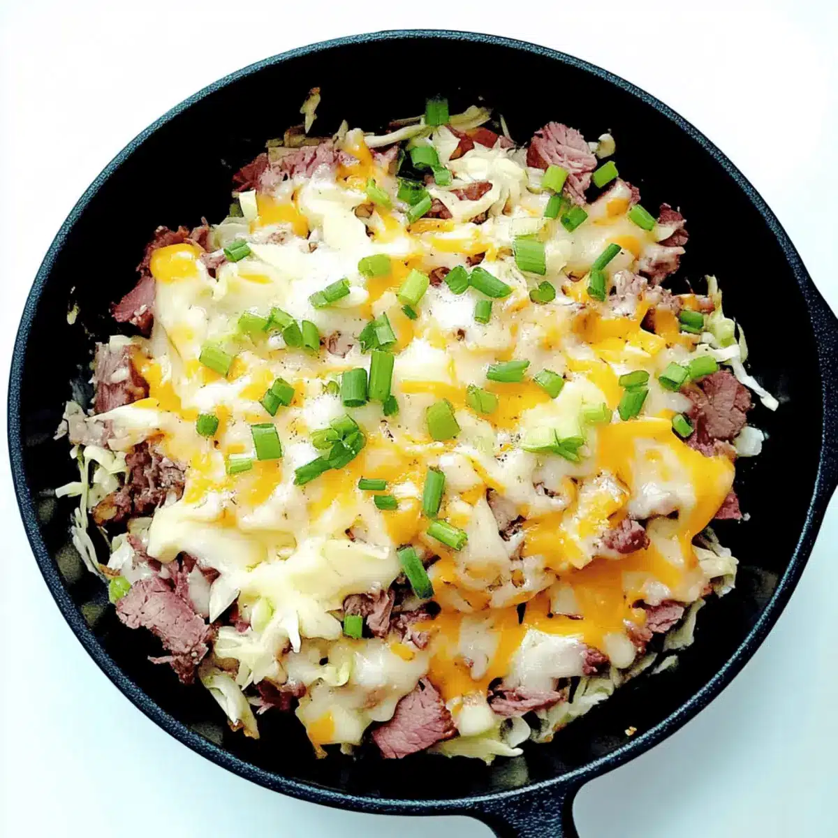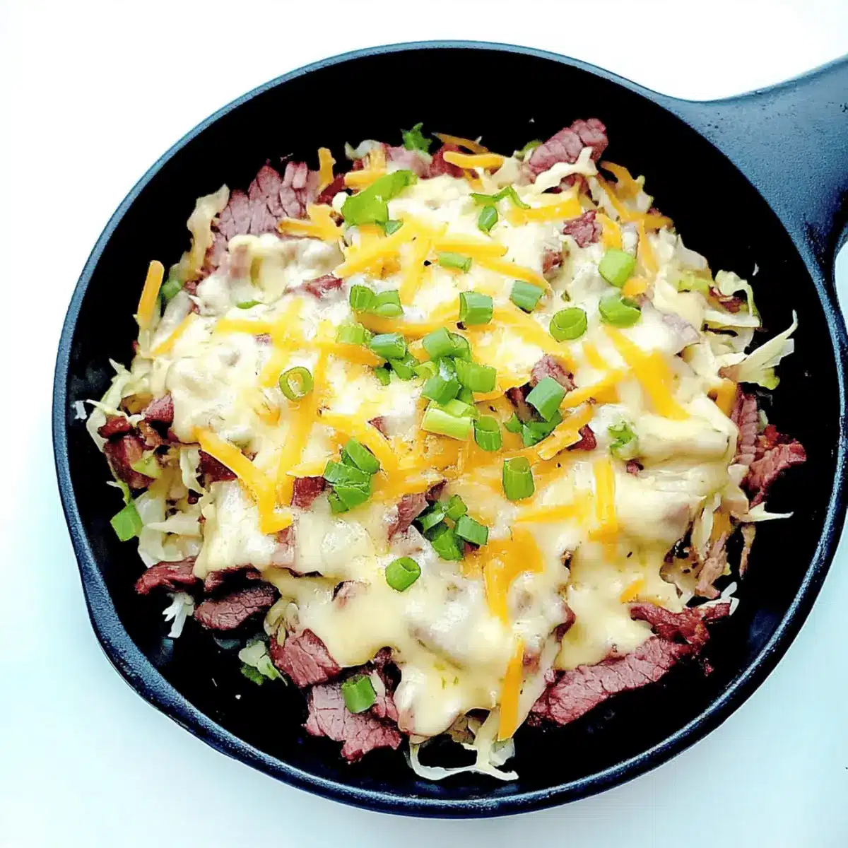 To finish, top your bowl with freshly chopped scallions for a pop of color and flavor. Serve immediately while it’s hot, inviting everyone to dig into this hearty, low-carb meal that captures the essence of a classic Reuben sandwich without the bread.
