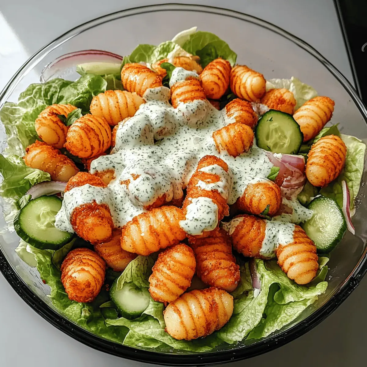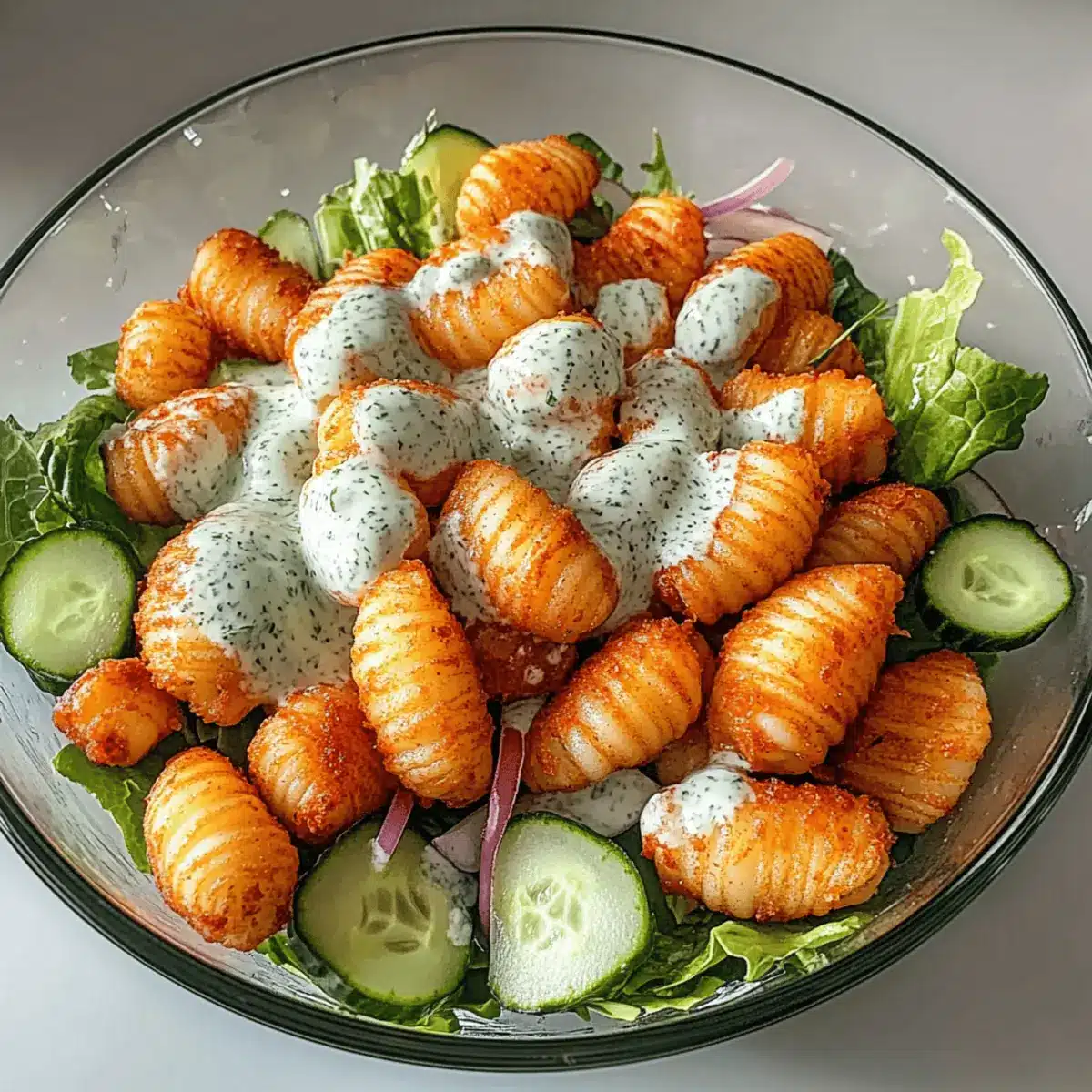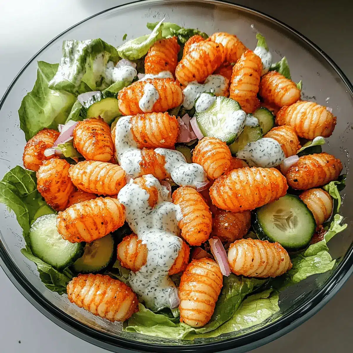 **Crispy, ** The delightful crunch of air-fried gnocchi makes this salad an absolute treat.