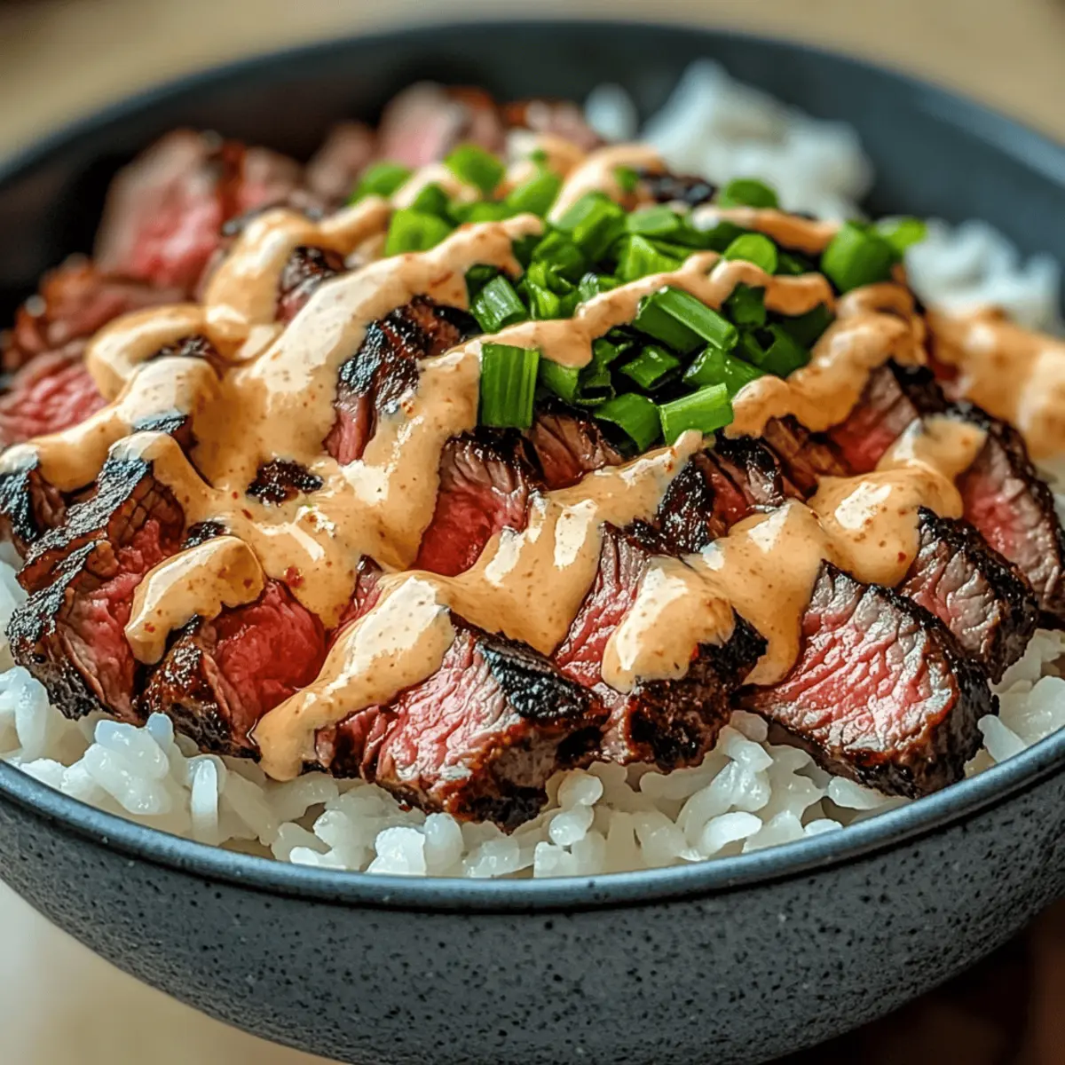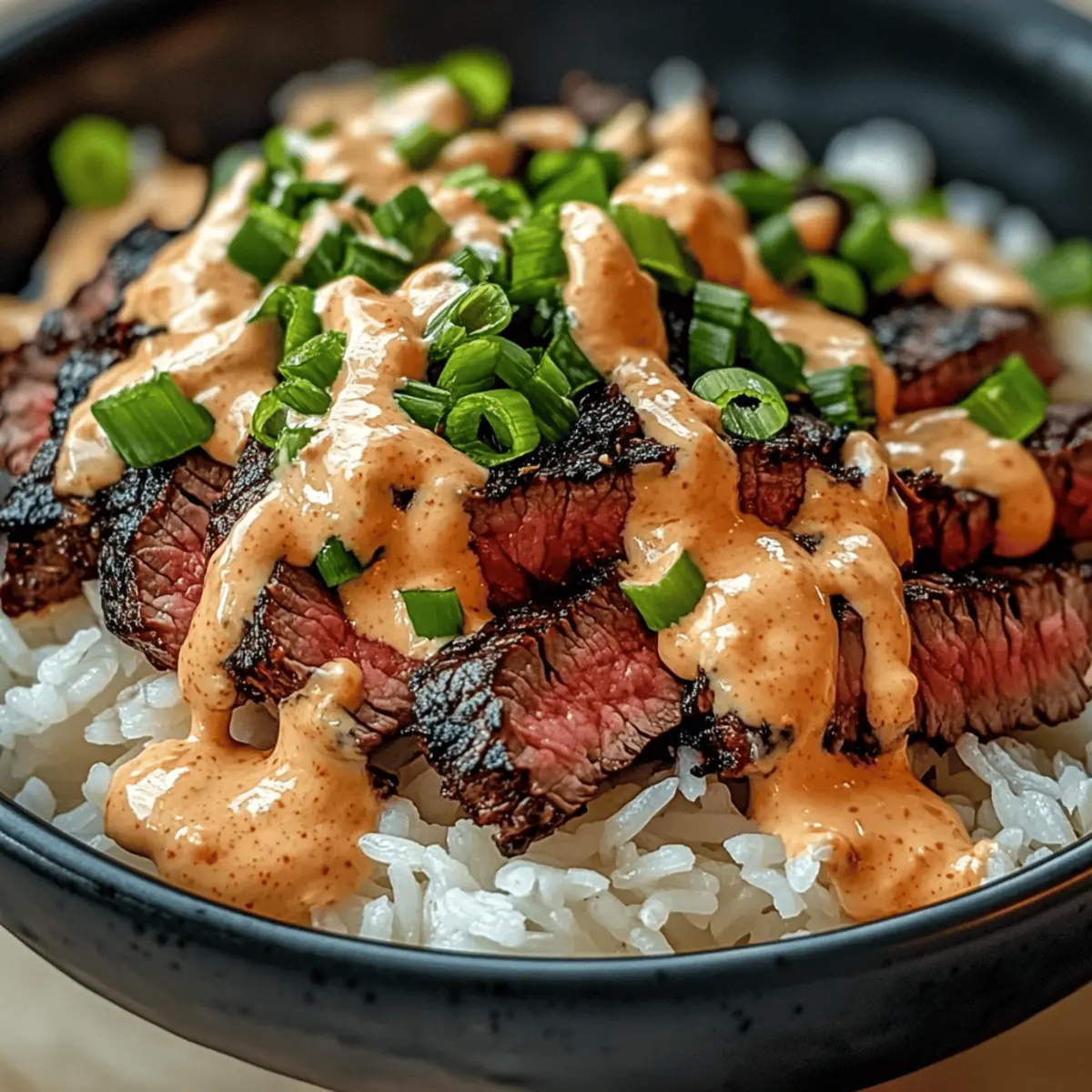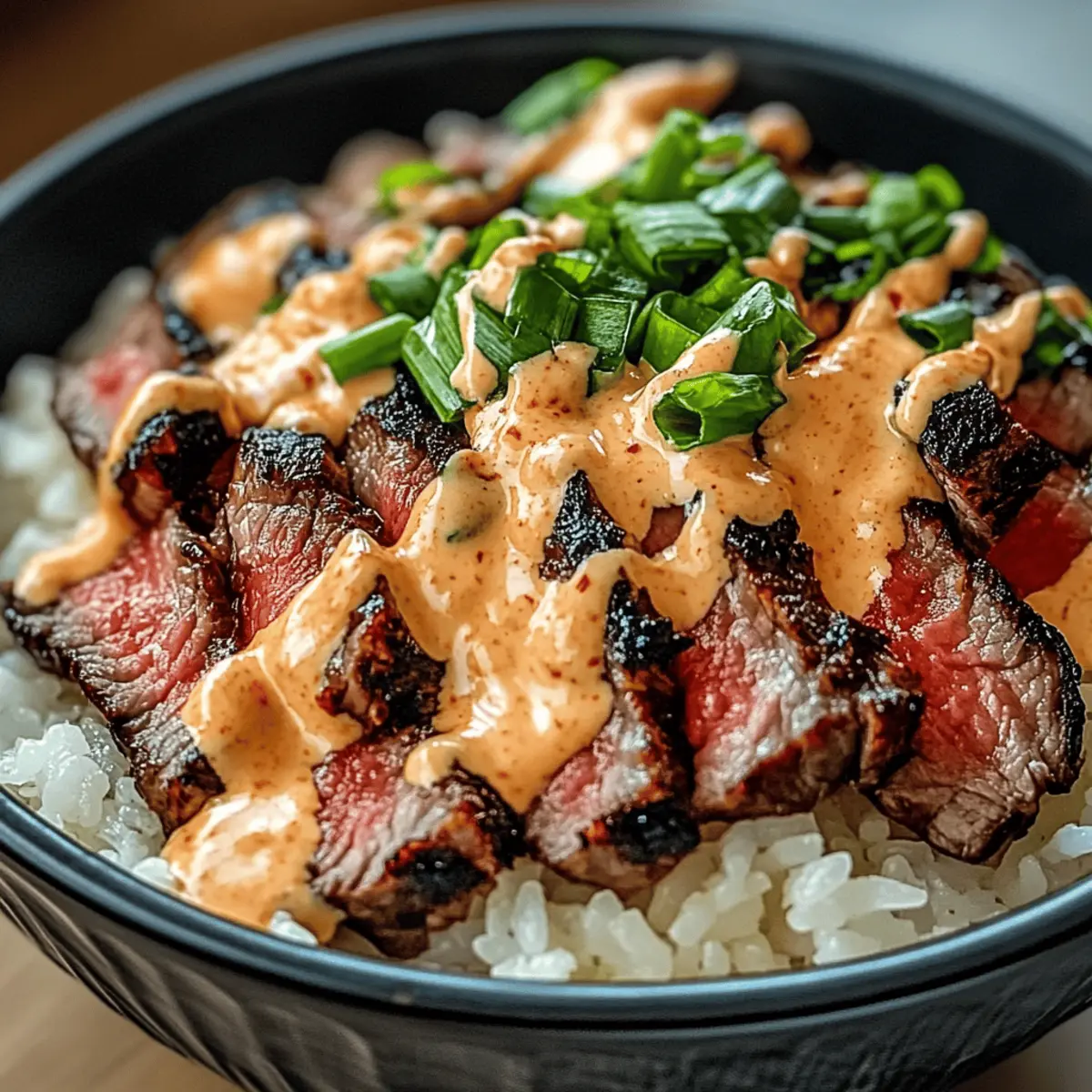- Assemble the bowls by placing a generous scoop of fluffy rice in each bowl. Top with sliced steak and drizzle with spicy cream sauce. Sprinkle with chopped green onions.