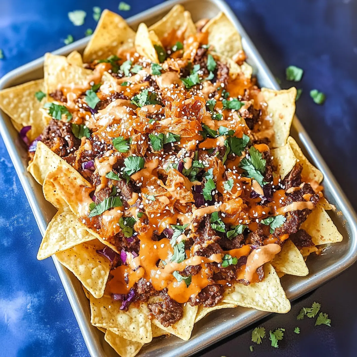 - Garnish the nachos with caramelized kimchi, drizzle with Sriracha mayo, and sprinkle with cilantro and sesame seeds.