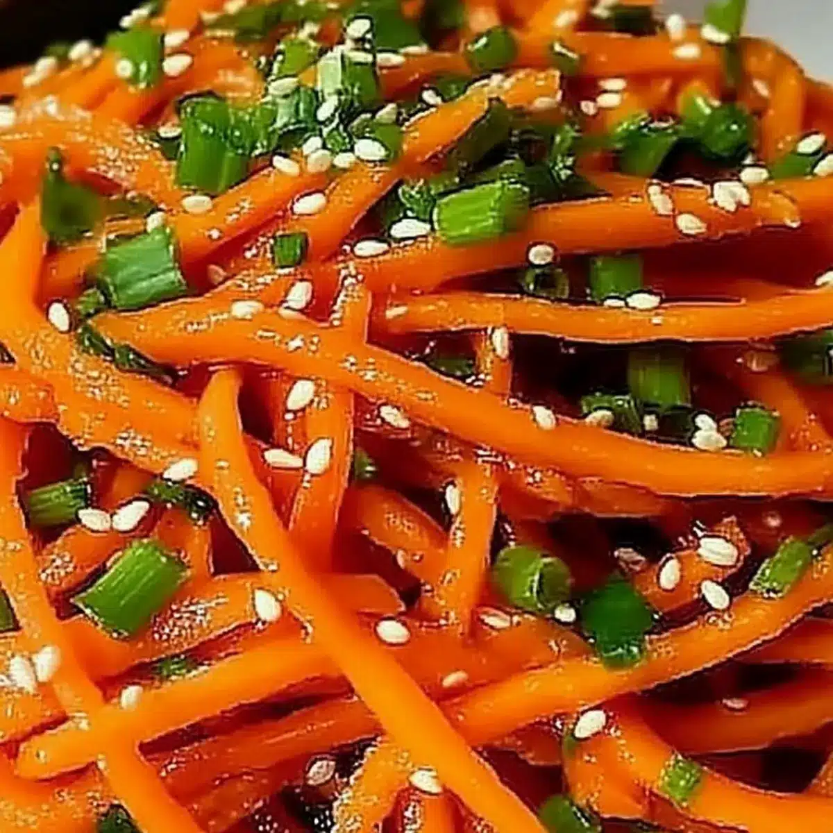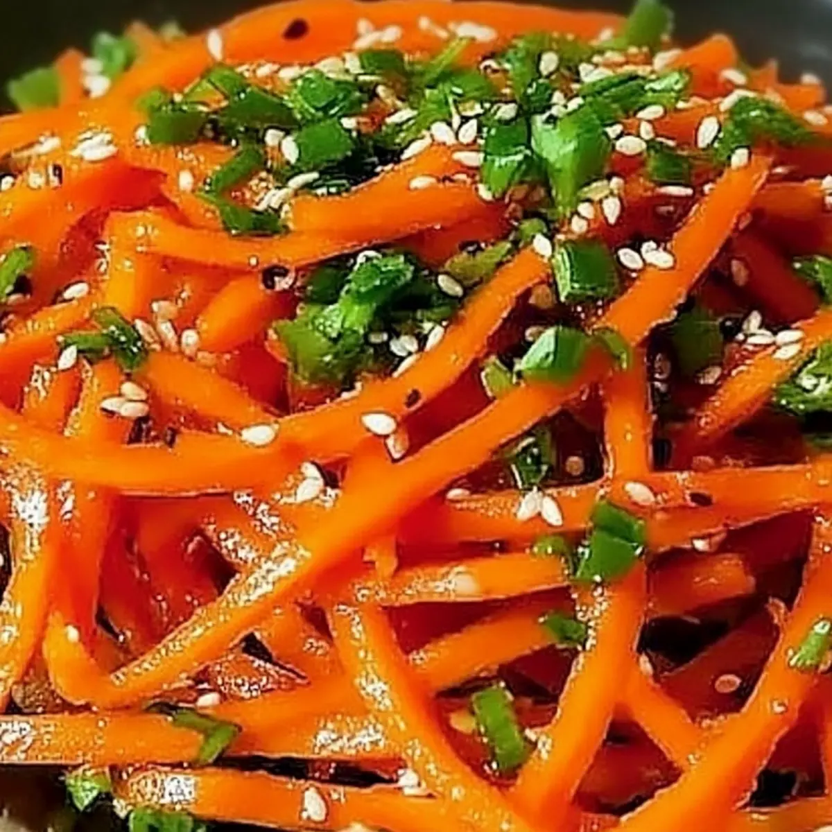 Vibrant Colors: This Korean Carrot Salad is a feast for the eyes, showcasing a stunning array of orange and green that brightens any table.