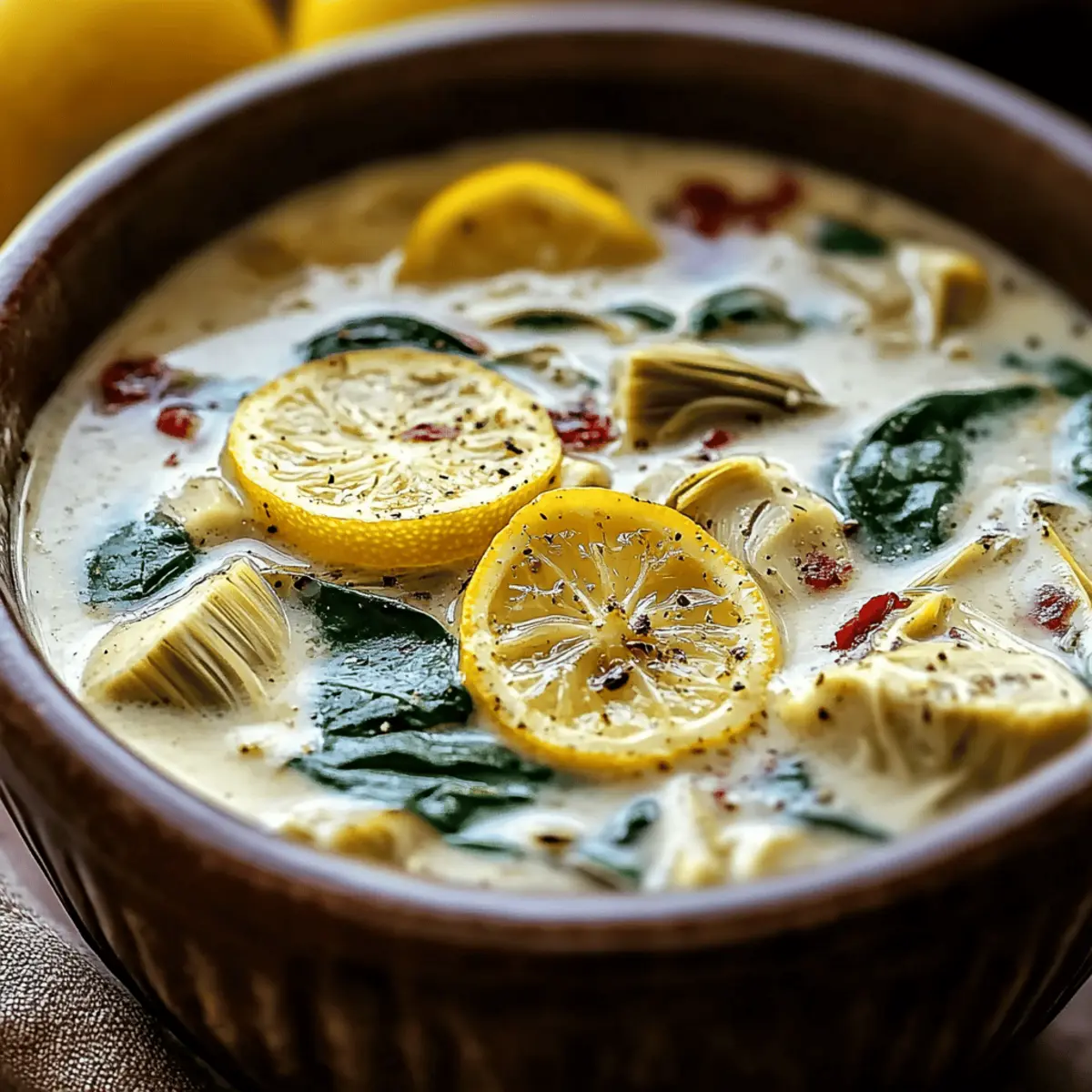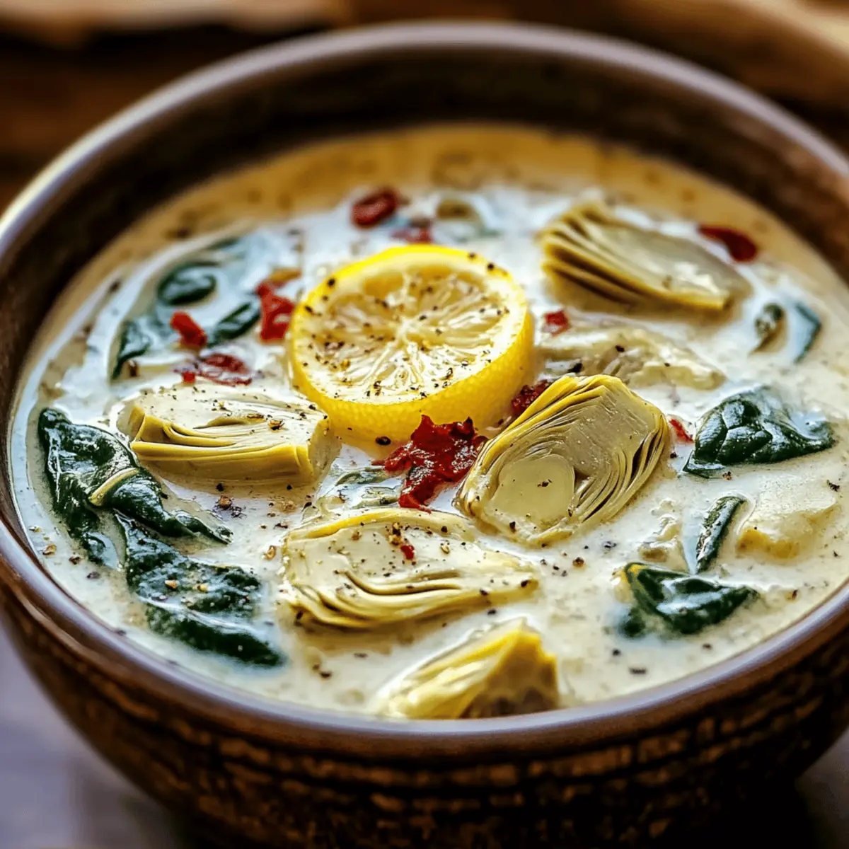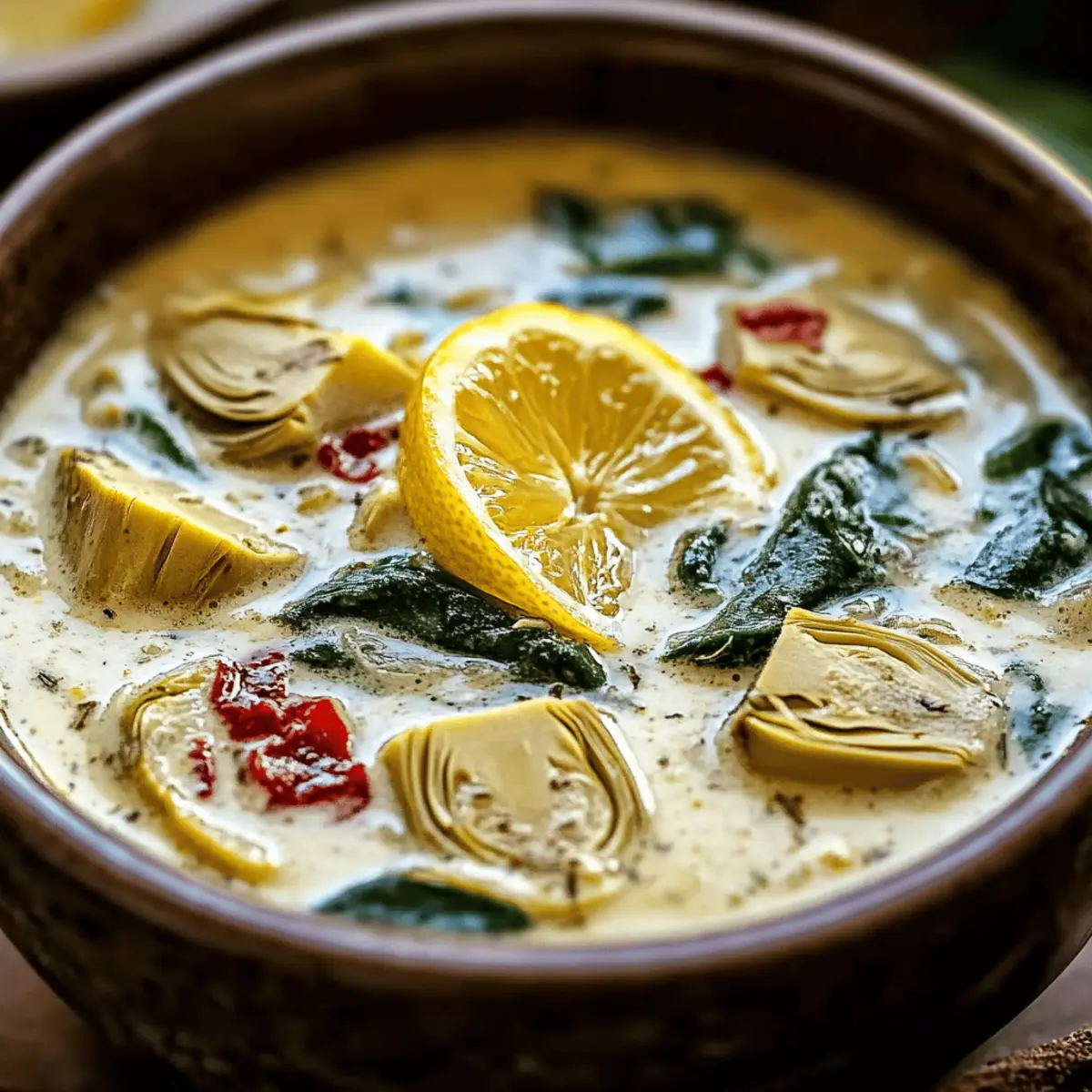 After simmering, remove the lid and add 1 cup of packed fresh spinach along with ½ cup of heavy cream. Stir gently and cook for an additional 2-3 minutes until the spinach wilts and the soup takes on a creamy texture. The creamy element balances the tangy lemon and nutty artichokes beautifully.