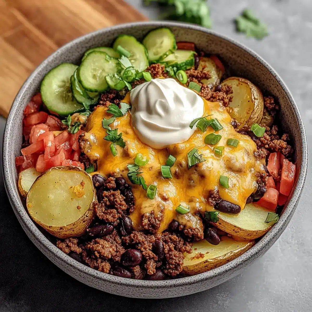 Spoon the seasoned ground beef or black beans over the cheese on each bowl. Now it’s time to get creative! Add your favorite toppings, such as fresh salsa, diced green onions, chopped cilantro, and a dollop of sour cream or Greek yogurt to enhance the flavors and textures in your Loaded Fiesta Potato Bowls.