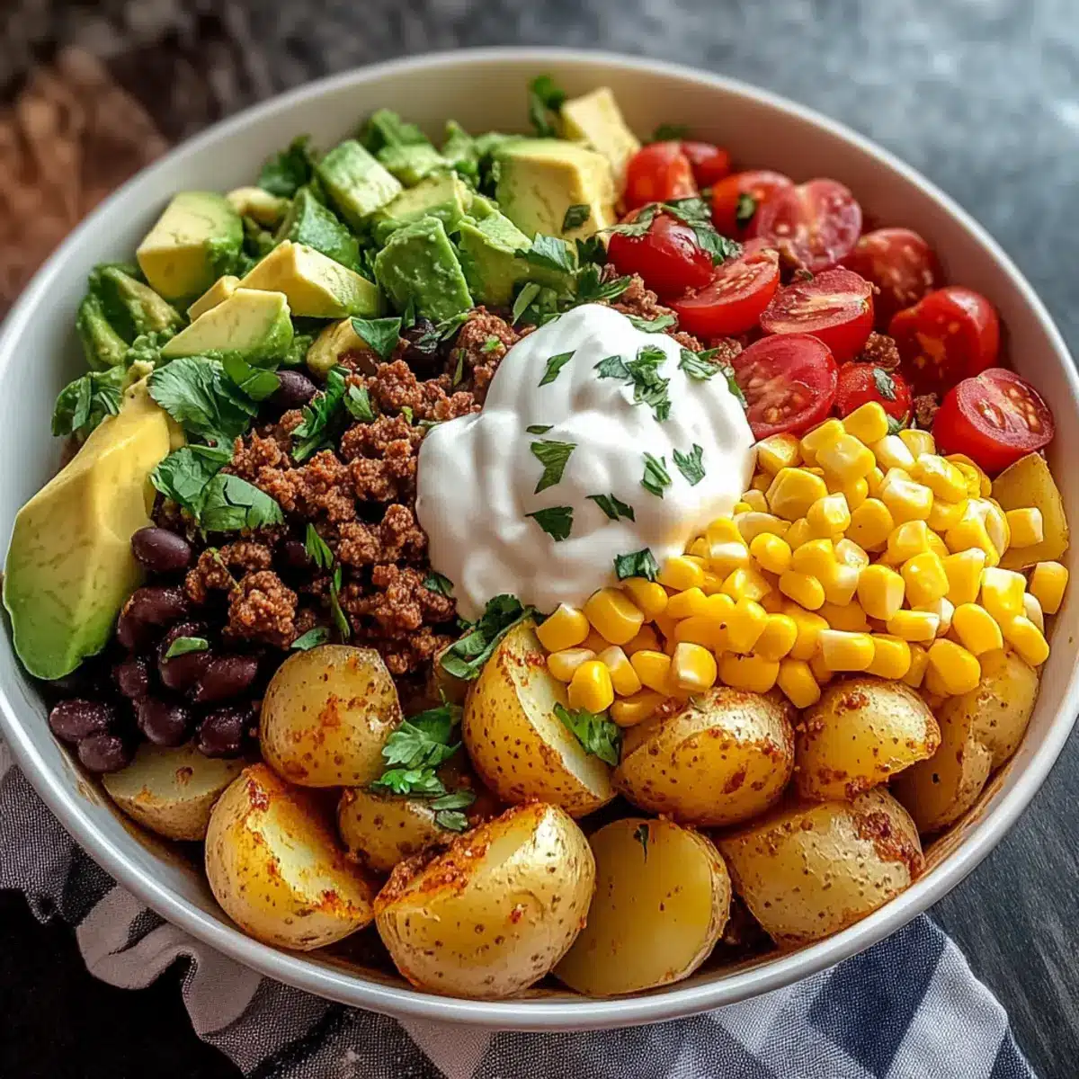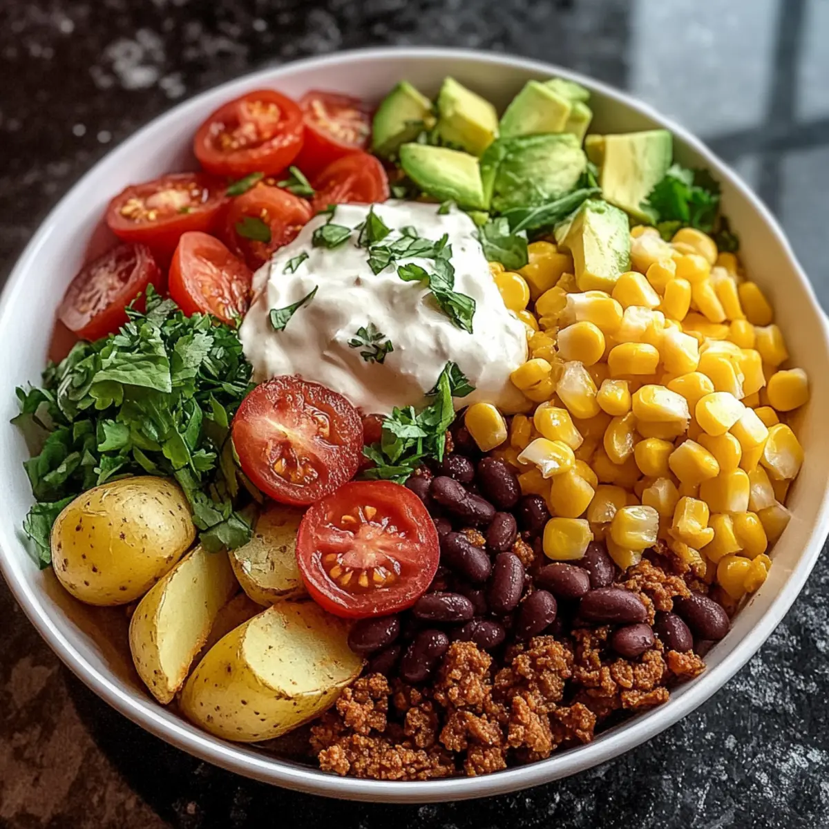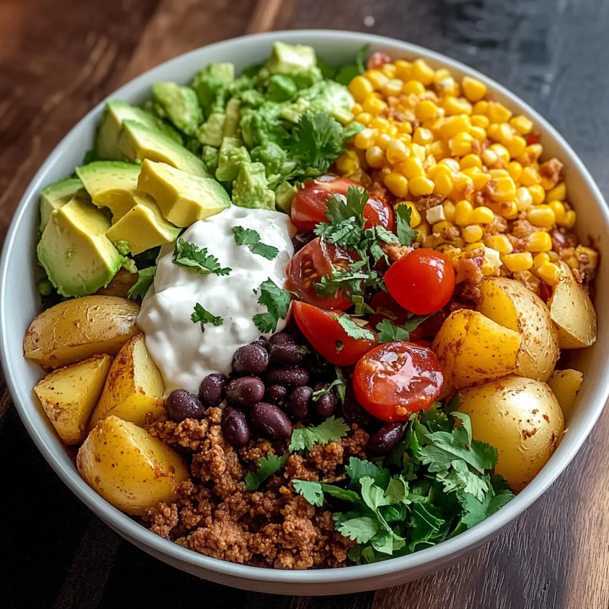 • Ground Beef or Turkey – Provides heartiness; substitute with black beans or tofu for a vegetarian Loaded Potato Taco Bowl.