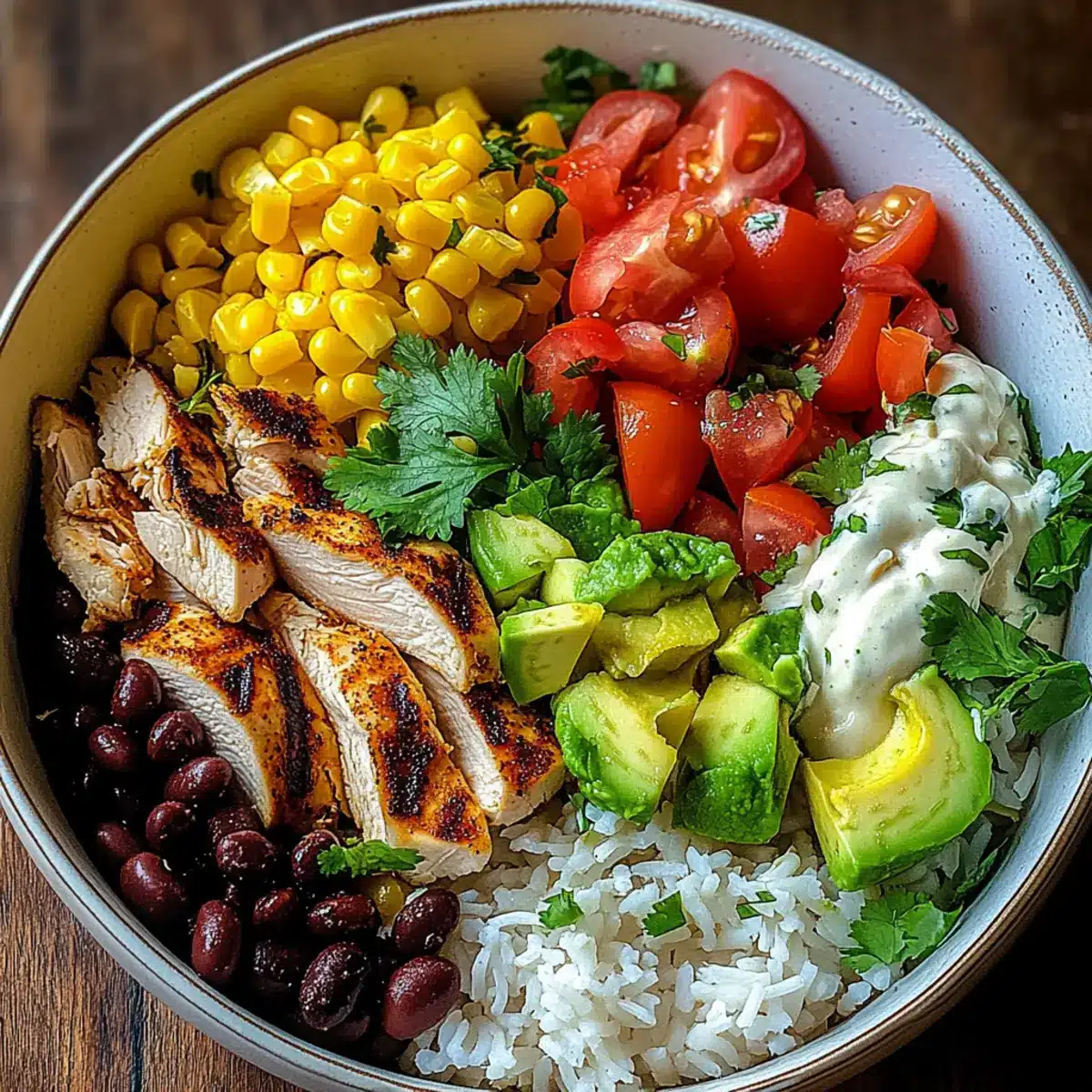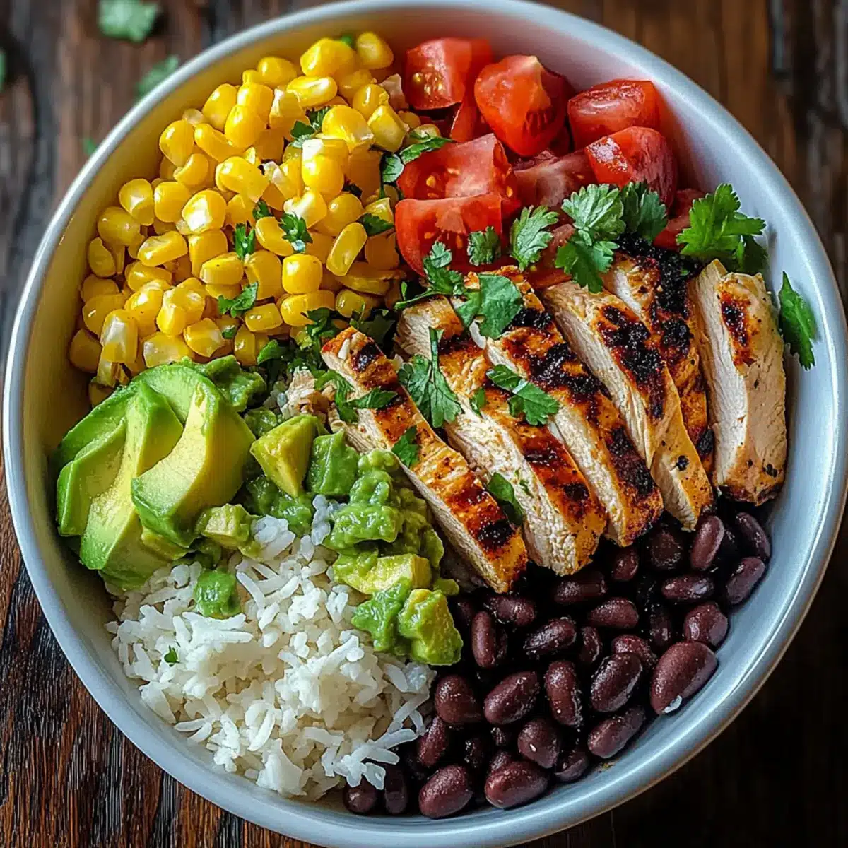 - In serving bowls, add a generous portion of the rice as the base. Top with black beans, corn, diced tomatoes, and sliced chicken. Sprinkle fresh cilantro on top.