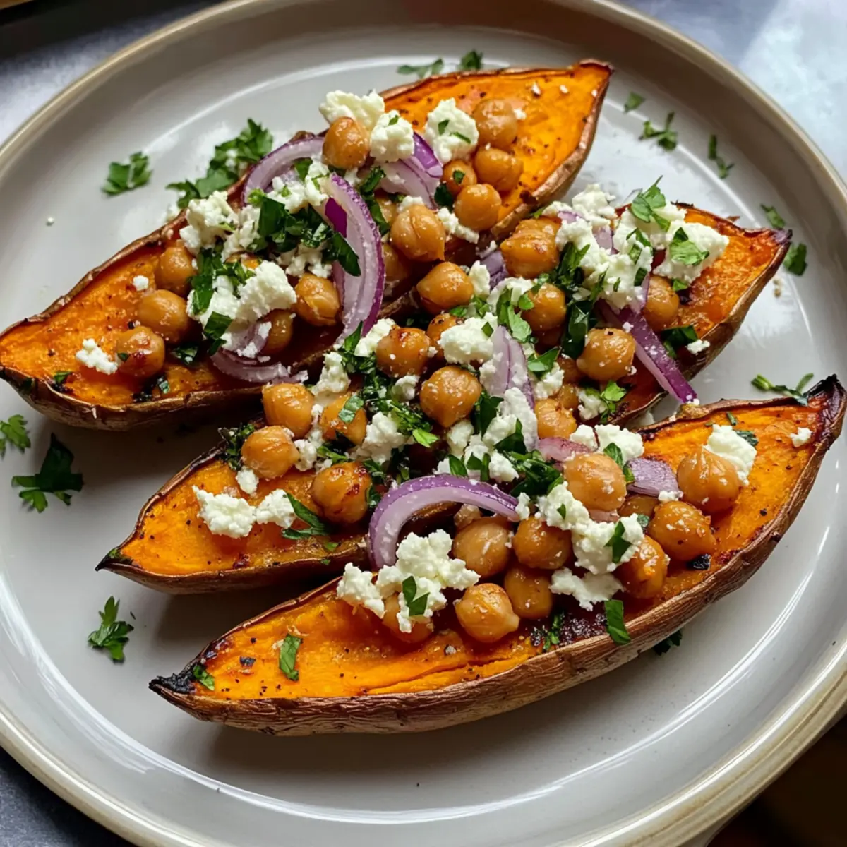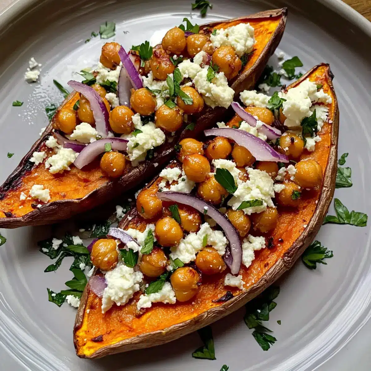 Once the sweet potatoes and chickpeas are done roasting, it’s time to assemble your Loaded Roasted Sweet Potatoes. Scoop a generous dollop of creamy hummus onto the cut side of each sweet potato. Top them with the crispy chickpeas, followed by slices of red onion, a sprinkle of fresh parsley, and optional vegan feta cheese for that extra zing.