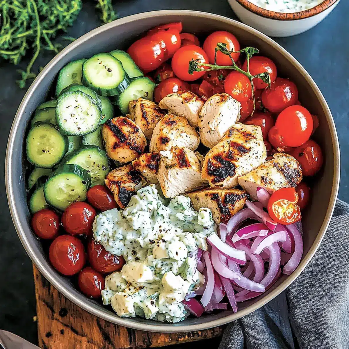 Just before serving, add a generous dollop of your chilled Tzatziki sauce on top of each bowl. This creamy addition not only enhances the flavor but also brings a refreshing element to your Low-Carb Greek Chicken Bowls. Serve immediately and enjoy this delightful feast that’s bursting with Mediterranean flair!